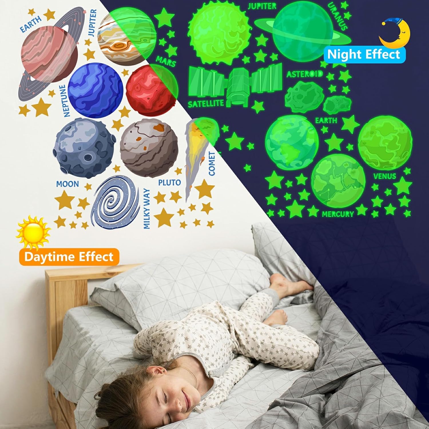 - ✦ DIY Wall Decals: You will get 4 sheets (Size of each sheet: 11.8 x 8.26 inch) of glowing cosmic planets wall decals in a set, including Earth,Moon, Pluto, Comet, Mars, Jupiter, Venus, Mercury, Uranus, Asteroid, Neptune, Satellite, Milky Way. Super bright luminous wall stickers to turn your kid's room into a vivid and realistic cosmic galaxy world, can be combined arbitrarily to create your own starry sky.