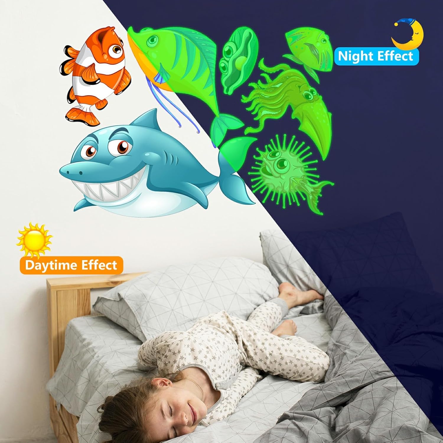 Glow in The Dark Ocean Fish Stickers, 36 PCS Glowing Luminous Sea Life Animals Wall Decals Under The Sea Ceiling Stickers for Kids Boys Girls Bedroom Nursery Playroom Party Room Decor