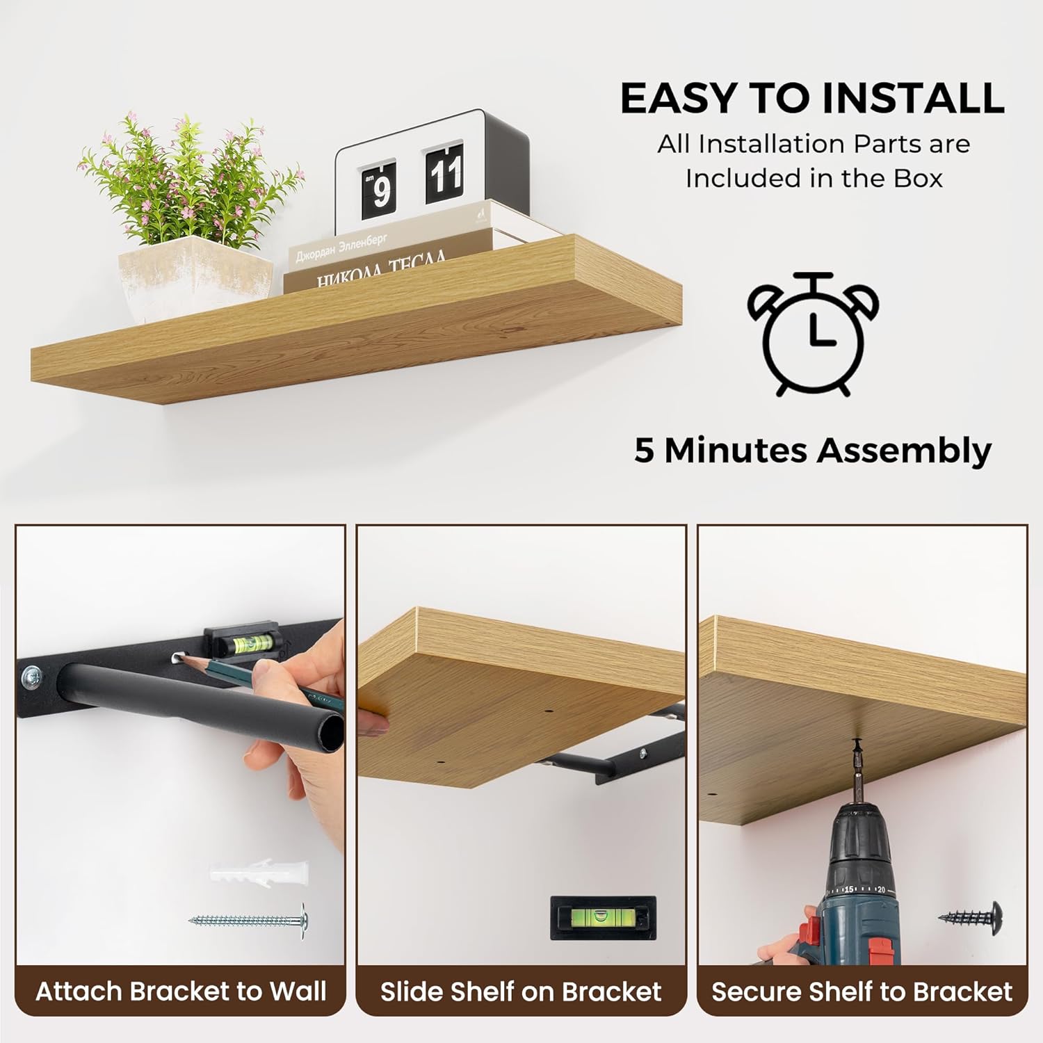 - Easy to install :Our wall floating shelves are designed for easy installation, with detailed instructions that allow you to set them up in just 8 minutes—no professional skills required. The shelves feature a smooth, durable surface. Simply wipe with a damp cloth to keep them looking pristine and clean, offering both convenience and long-lasting functionality.