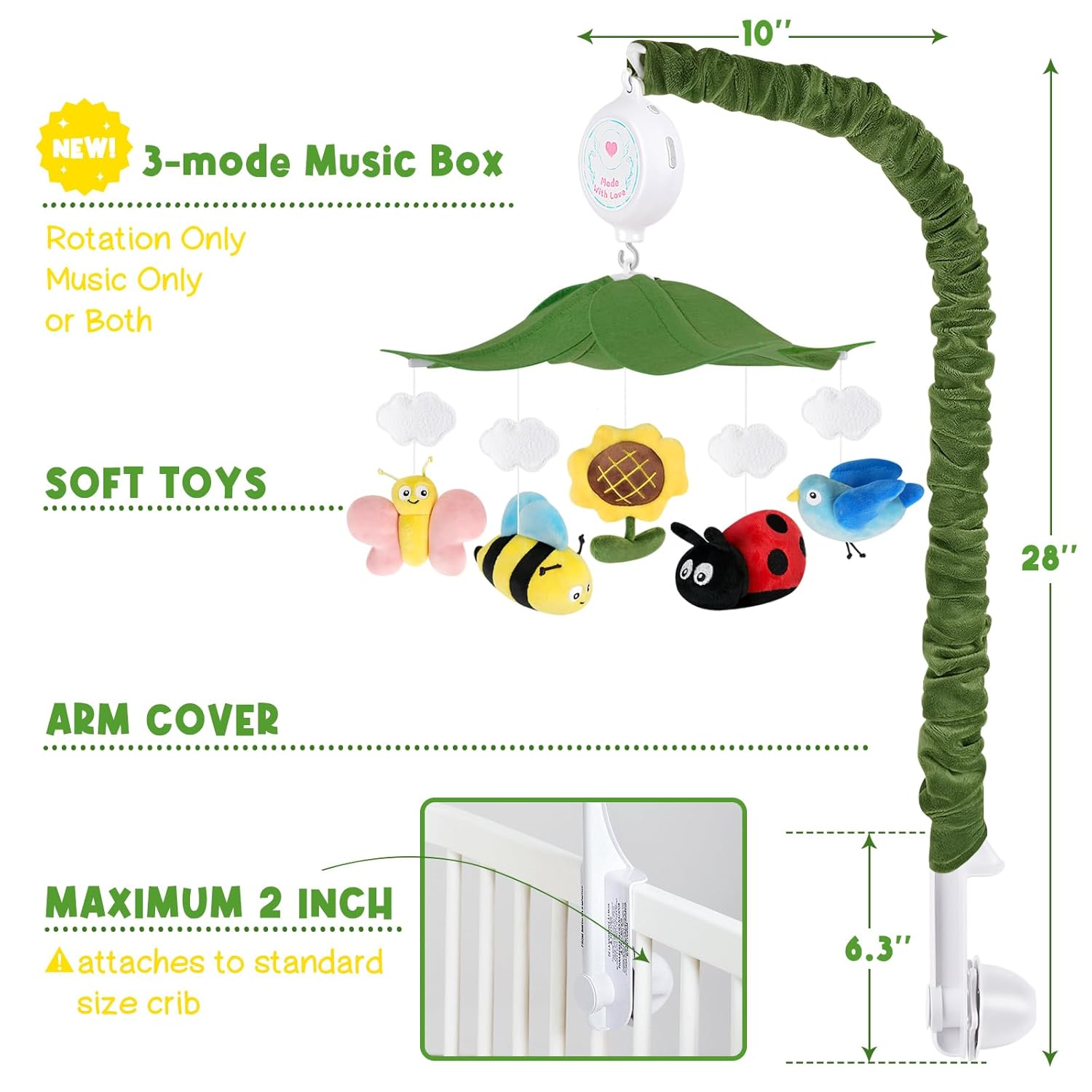 - Fits Standard Cribs: Designed to fit most standard cribs, the mobile is easy to attach, ensuring a secure and stable setup. Both the plastic parts and the plush fabric cover are washable, ensuring a clean and hygienic environment for your baby