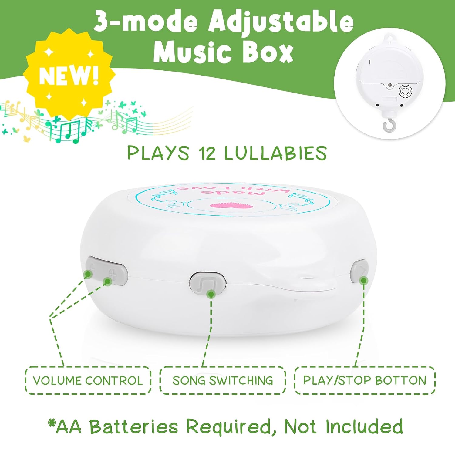 - 12 Soothing Lullabies: The newly upgraded 3-mode adjustable music box lets you choose between Rotation Only, Music Only, or Both. As the gentle melodies play, the toys slowly spin, creating a calming atmosphere that makes bedtime a smoother and more enjoyable experience for both baby and parents