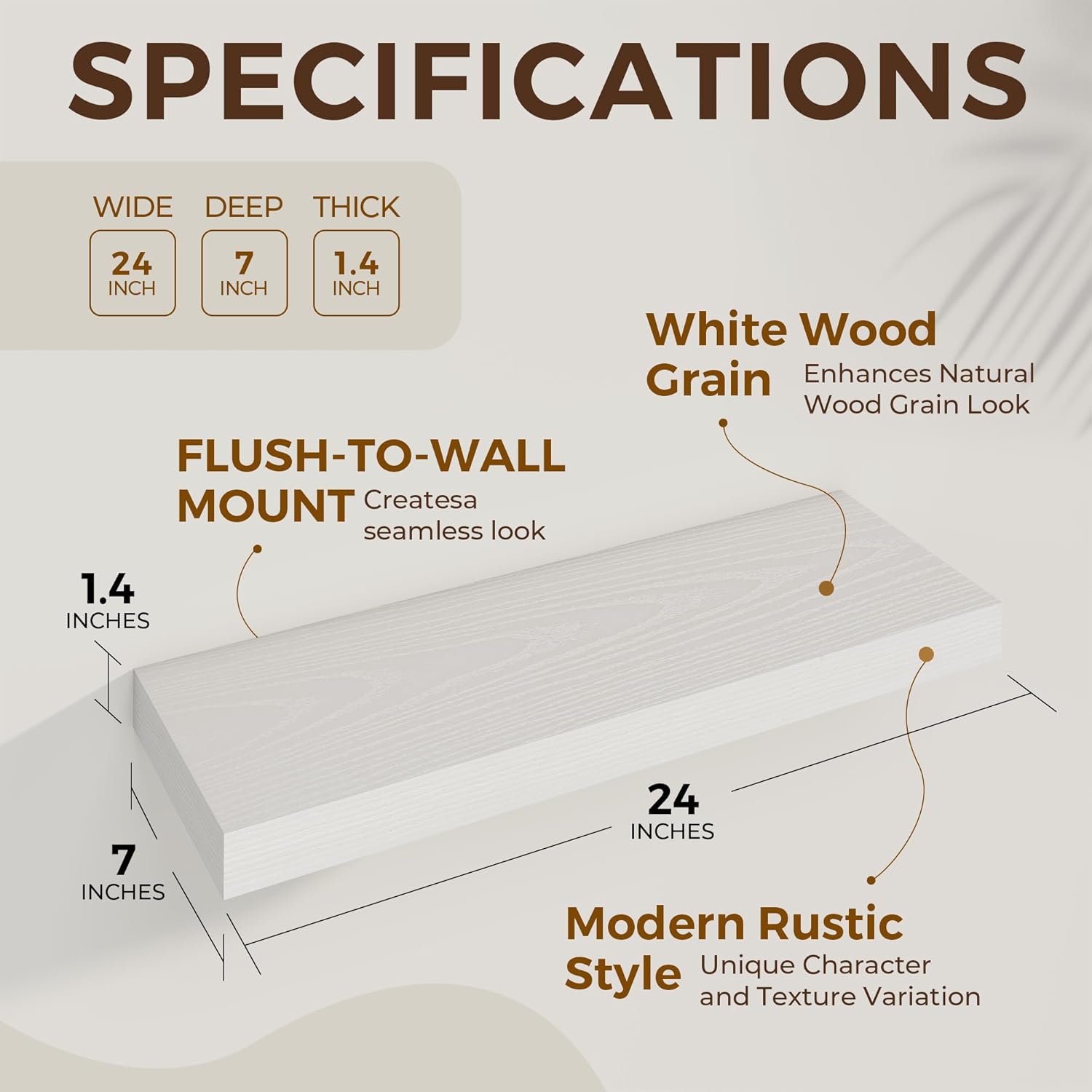 - With extra depth and thickness: This wall-mounted floating shelves measures 24"W x 6.7"D x 1.4"H, featuring an extra-deep and thickened design to maximize storage capacity and support up to 70 lbs. The large floating shelves robust construction allows you to safely display a variety of items, from books to décor. It helps reduce clutter and brings a sleek, modern touch to compact spaces, making it perfect for showcasing your favorite pieces without sacrificing functionality.