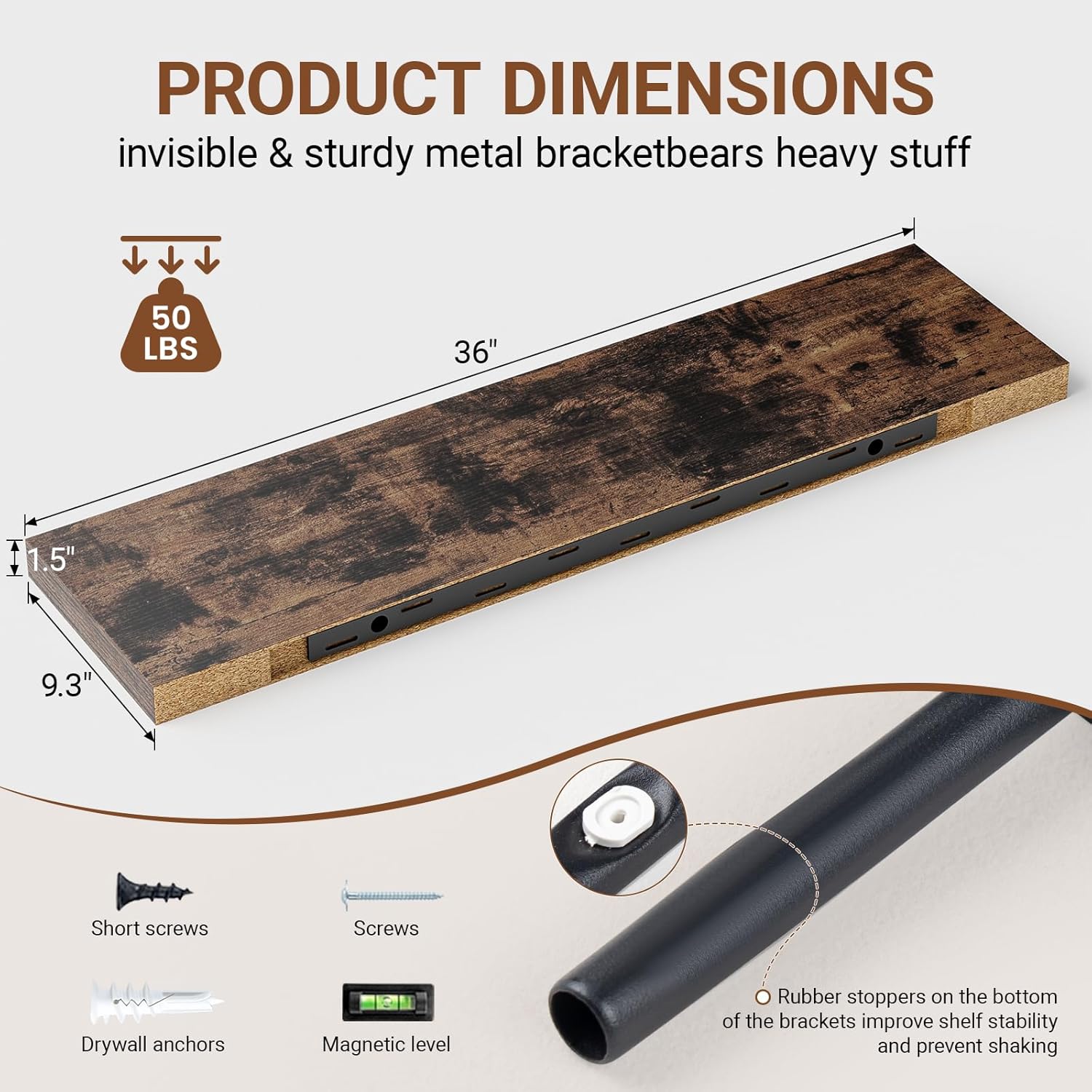 - ăSturdy & Reliable MaterialăThe brown floating shelves use metal brackets and screws to be firmly fixed to the wall without sagging.Our rustic brown floating shelves 36 inch are made of high quality MDF material,can hold up to 50 lbs to safely place your items.