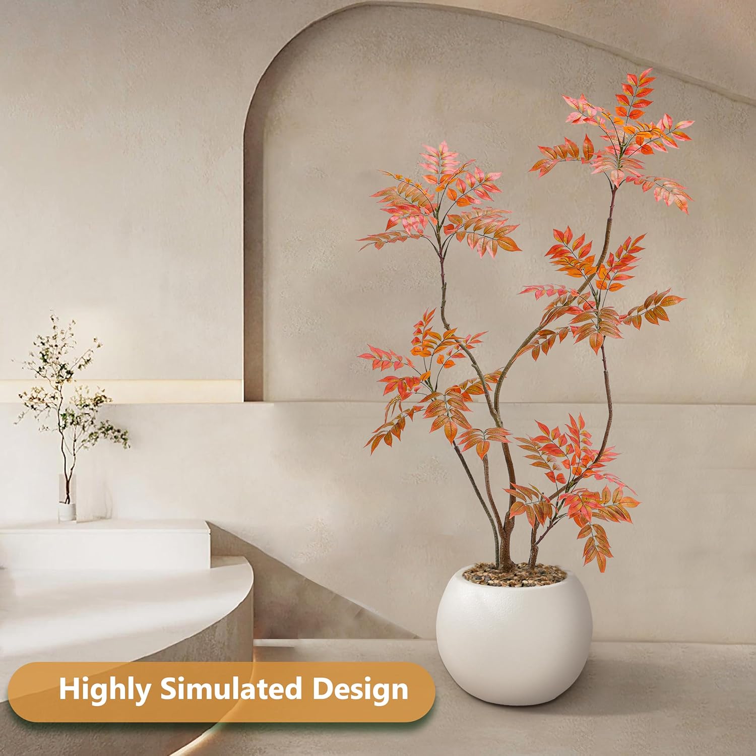 - Home Decor Accents: This 5ft/60in tall faux sumac tree contains 500 pieces real touch leaves who made of silk and each leaf has veins on it. Inclus a white planter(10"H x 10"W). The interior of the planter is made of sturdy concrete and the surface is decorated with non-falling coloured pebbles and the base use anti-tip tilt protection for greater stability