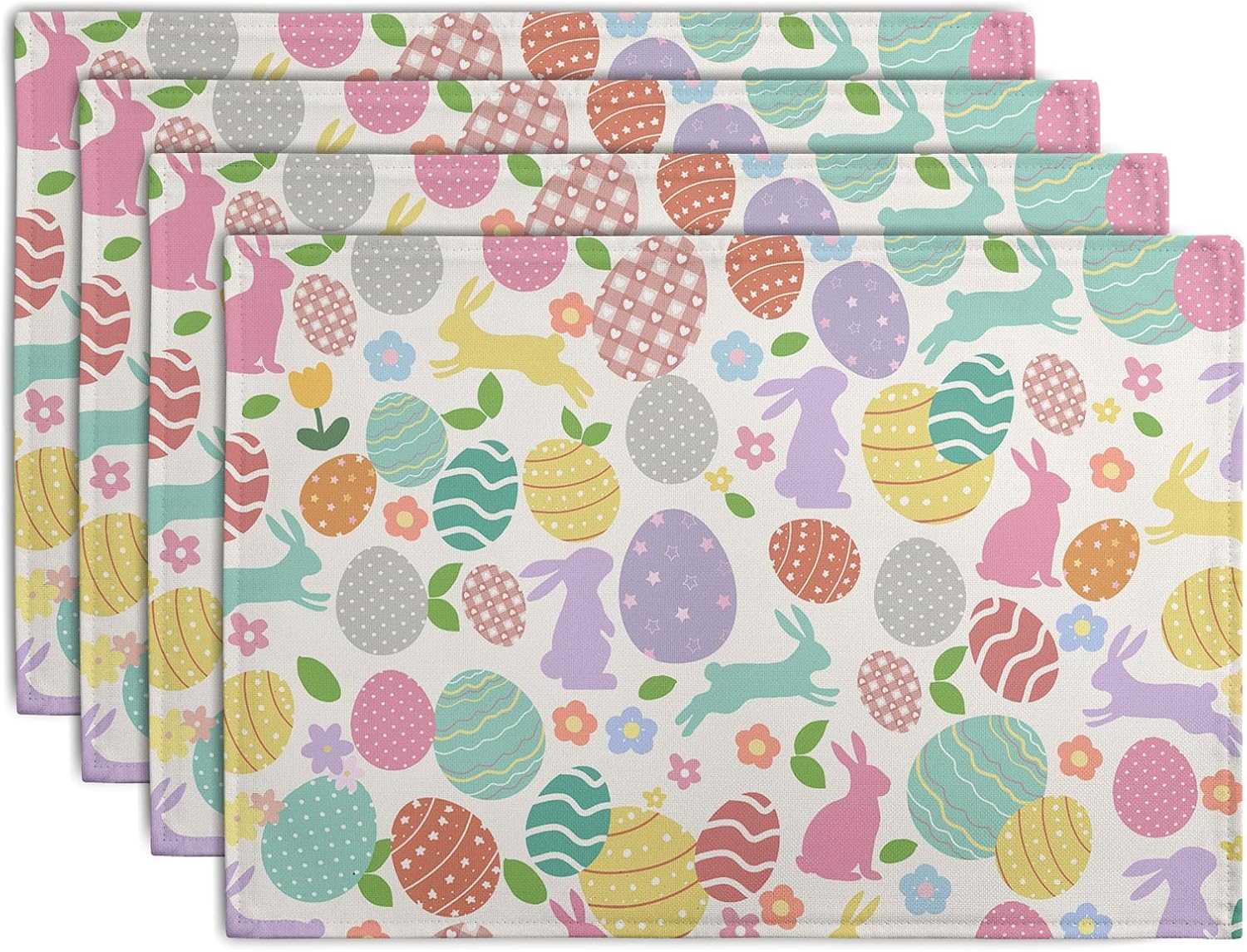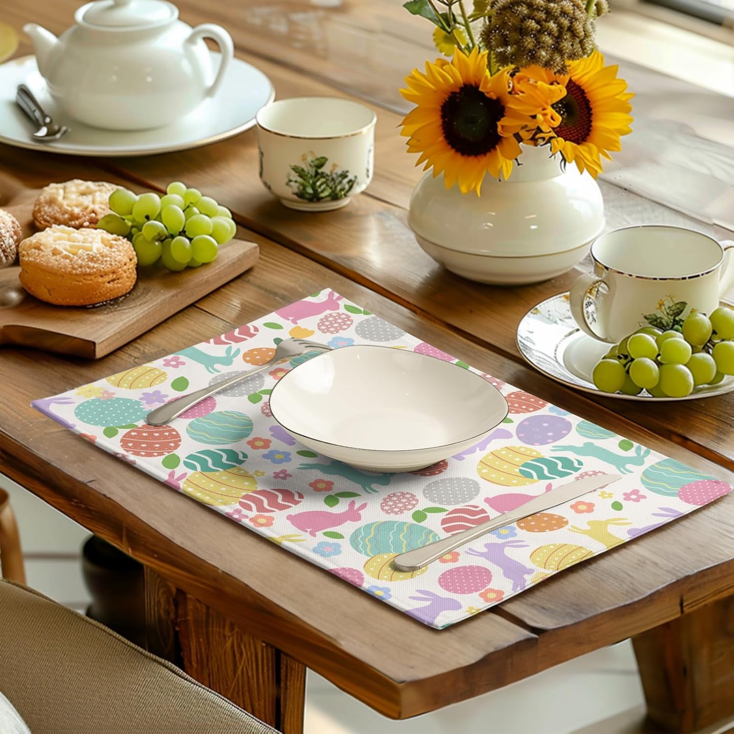 - TABLE DECORATION: Spring easter farmhouse table placemat feature high-definition printing technology for crisp, clear patterns and vibrant colors; rectangle placemats with a beautiful eggs rabbits pattern; unique and eye-catching seasonal patterns add charm to spring easter placemats, creating a festive atmosphere for your party