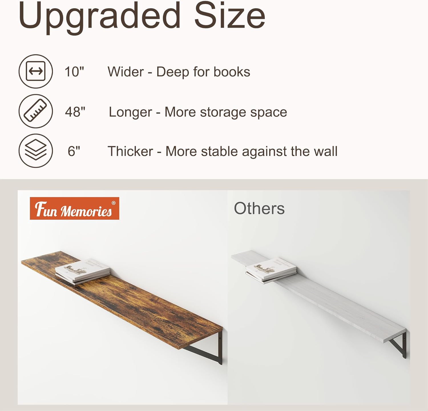 - ă10 INCH DEEP FLOATING SHELFăThis extra deeper and wider wall shelves are 10 inches in depth and 48 inches in length instead of the regular narrow floating shelves, you can put photos, pictures, DVD players, videos, books, toys, and some other knickknack on this beautiful display wooden shelf.