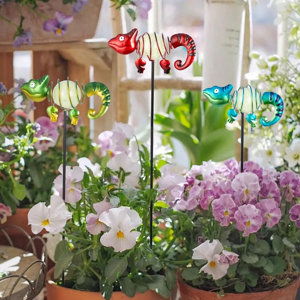 - Unique Design: These garden stakes are designed in the shape of vivid chameleons. The bright and eye-catching colors, including red, blue, and green, can quickly become the focal point of any garden. Each chameleon has a detailed and cute appearance, adding a touch of fun and liveliness to your outdoor space