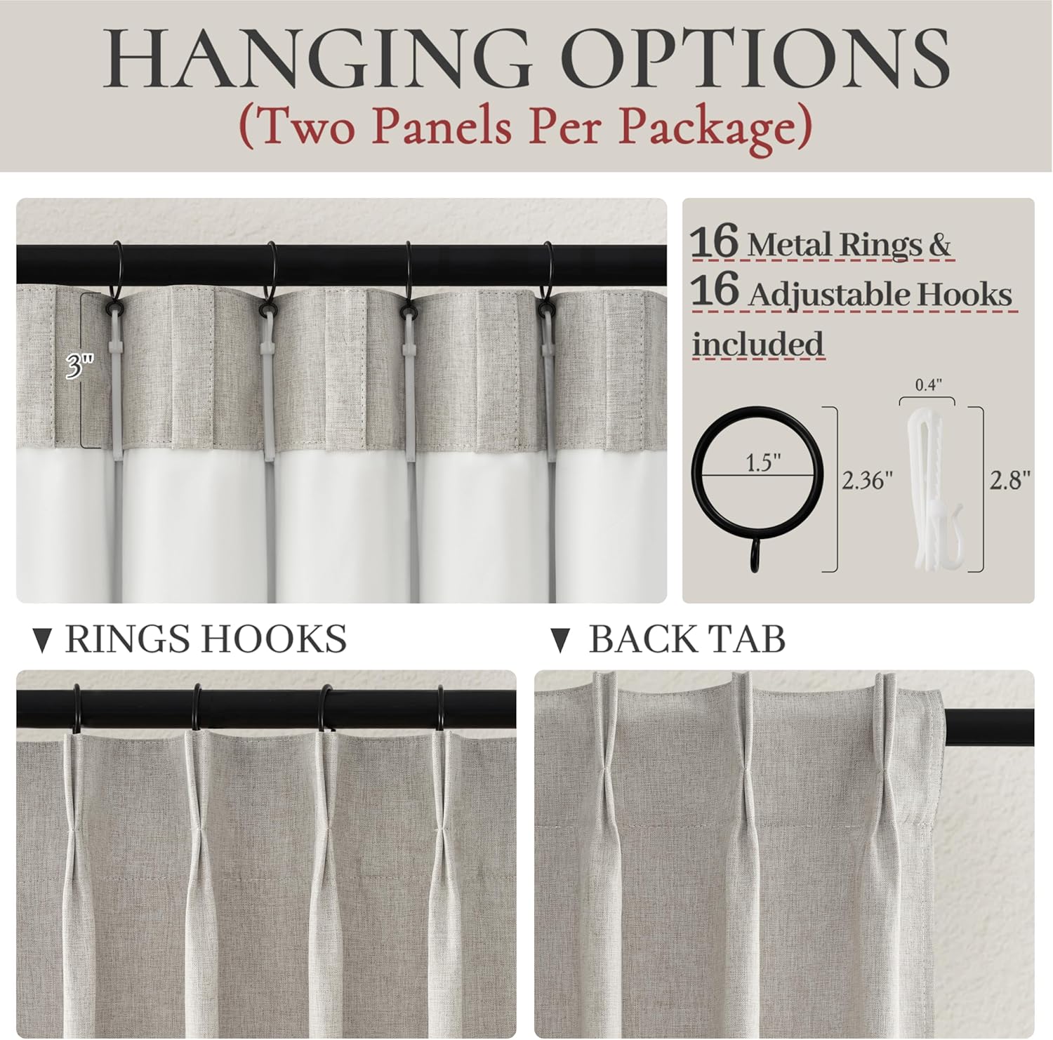 - Pinch Pleats Design:Each panel has 7 pleats.linen draperies are crafted from blended fabric(30%linen,70%polyester),drapes well and not easy-wrinkle.Suitable for various styles:modern,farmhouse,boho,neutral,bedroom,living room,nursery,sliding door,etc.