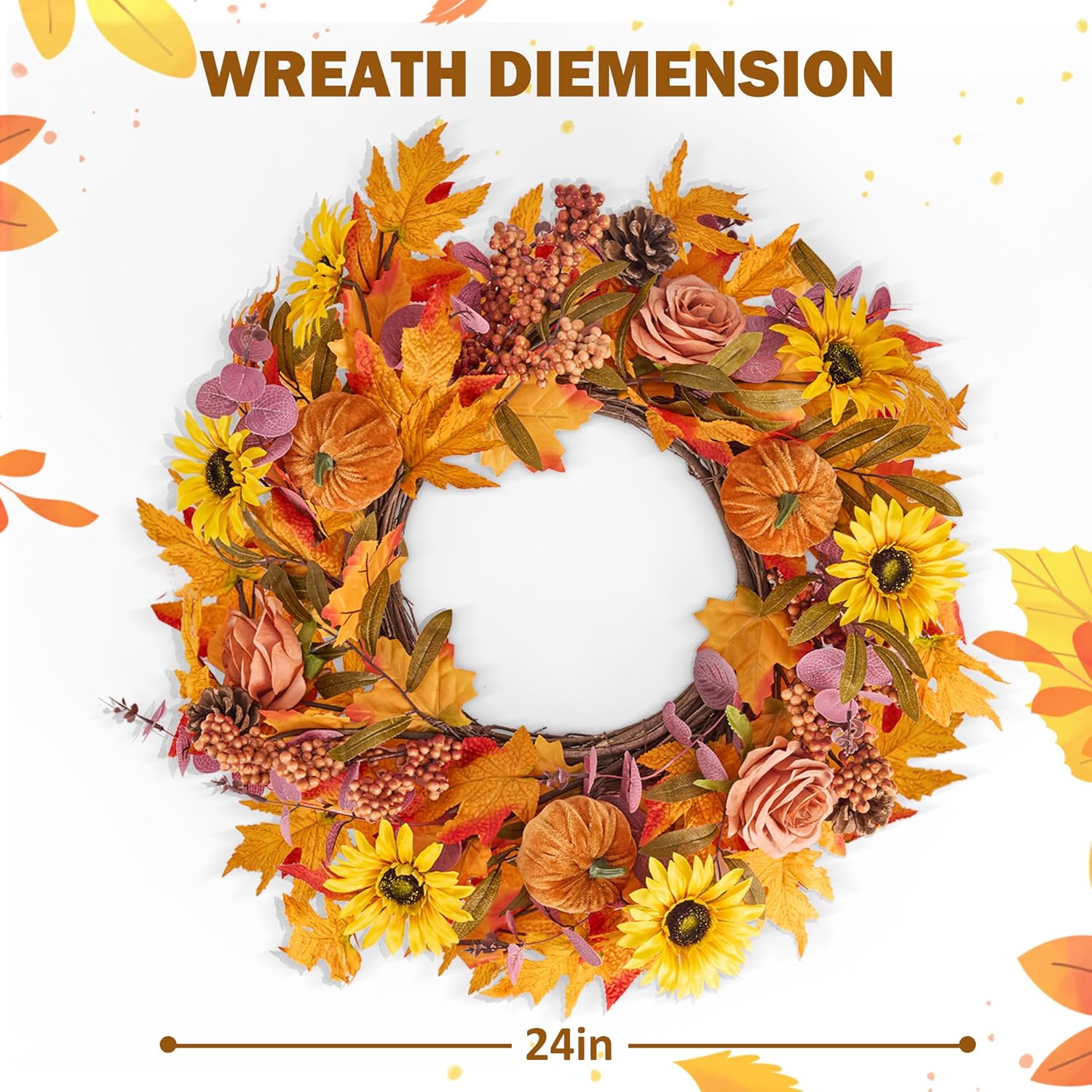 GENMOUS 24Inch Fall Wreaths for Front Door, Autumn Velvet Pumpkin Wreath Autumn Maple Leaves Porch Decor, Farmhouse Wreaths Home Wall Outdoor Indoor Thanksgiving Halloween Harvest Festival Fall Decor