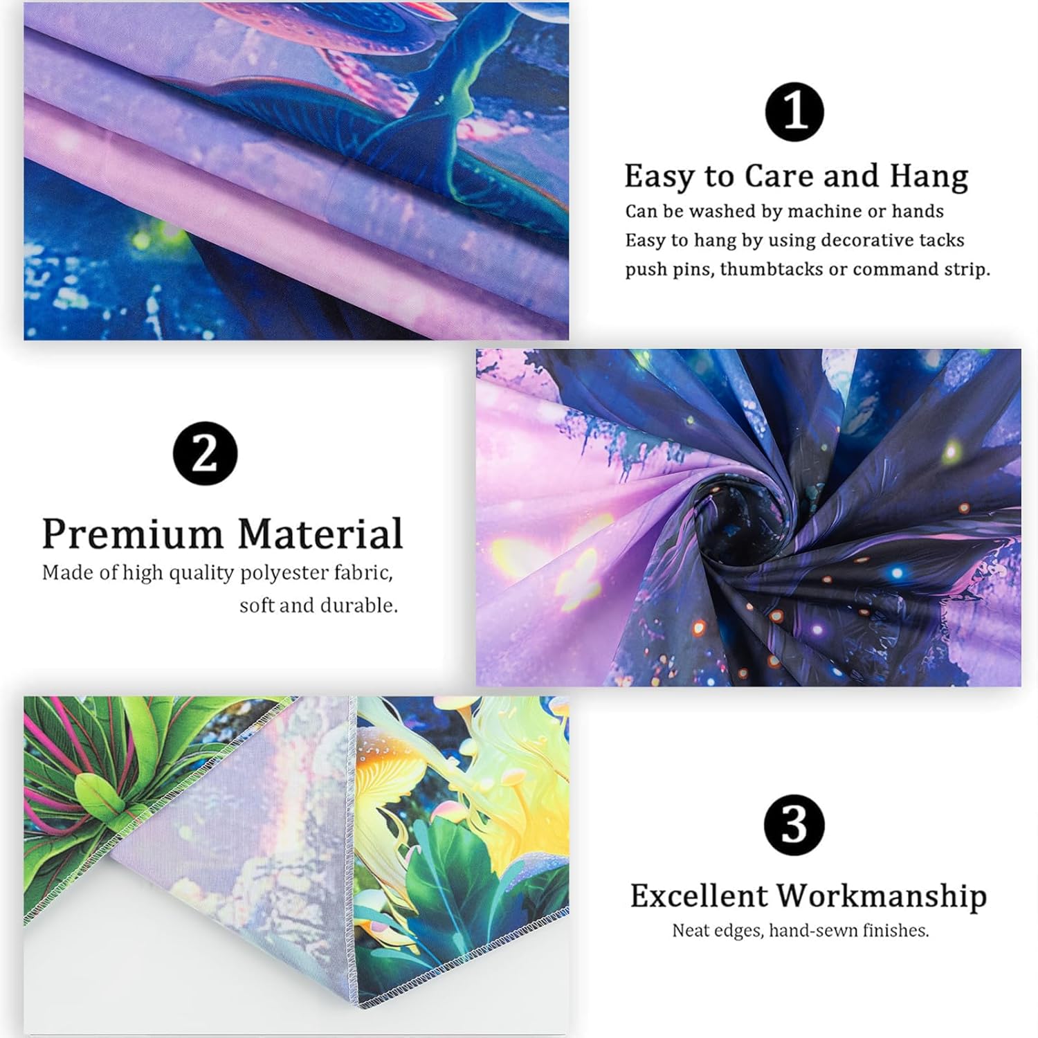 - [Glowing Blacklight Tapestry Design]: Reveal hidden UV-reactive details under blacklight, featuring bioluminescent mushrooms and magical forest creatures that create enchanting glow-in-the-dark bedroom ambiance