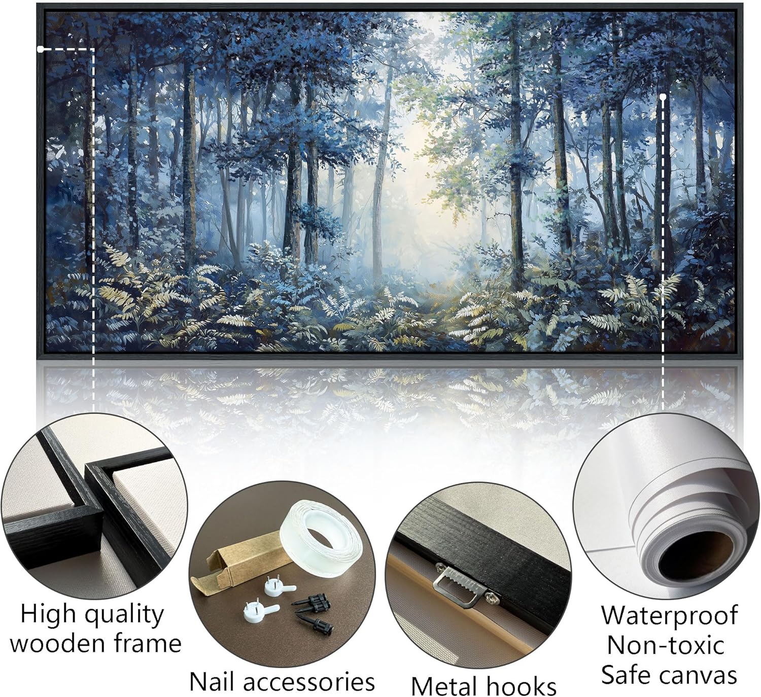- Navy Blue Canvas Wall Art Size: This 29×58 inches canvas wall art features a serene forest landscape in navy blue and lush green tones, perfect for adding calm and elegance to your living room, bedroom, or office.