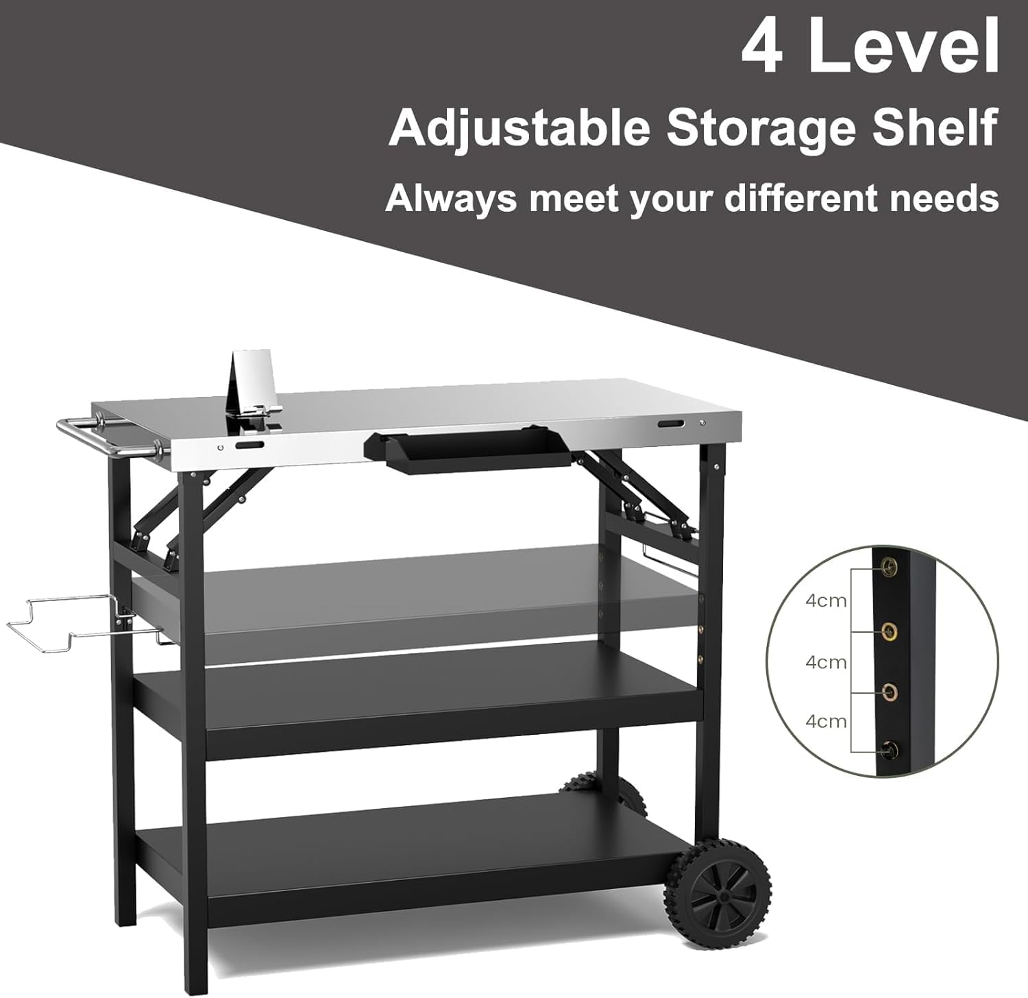 ERGOMASTER Grill Table Cart, Outdoor Kitchen Island with 4-Position Adjustable Shelf, Stainless Steel Serving Cart for Patio Garden