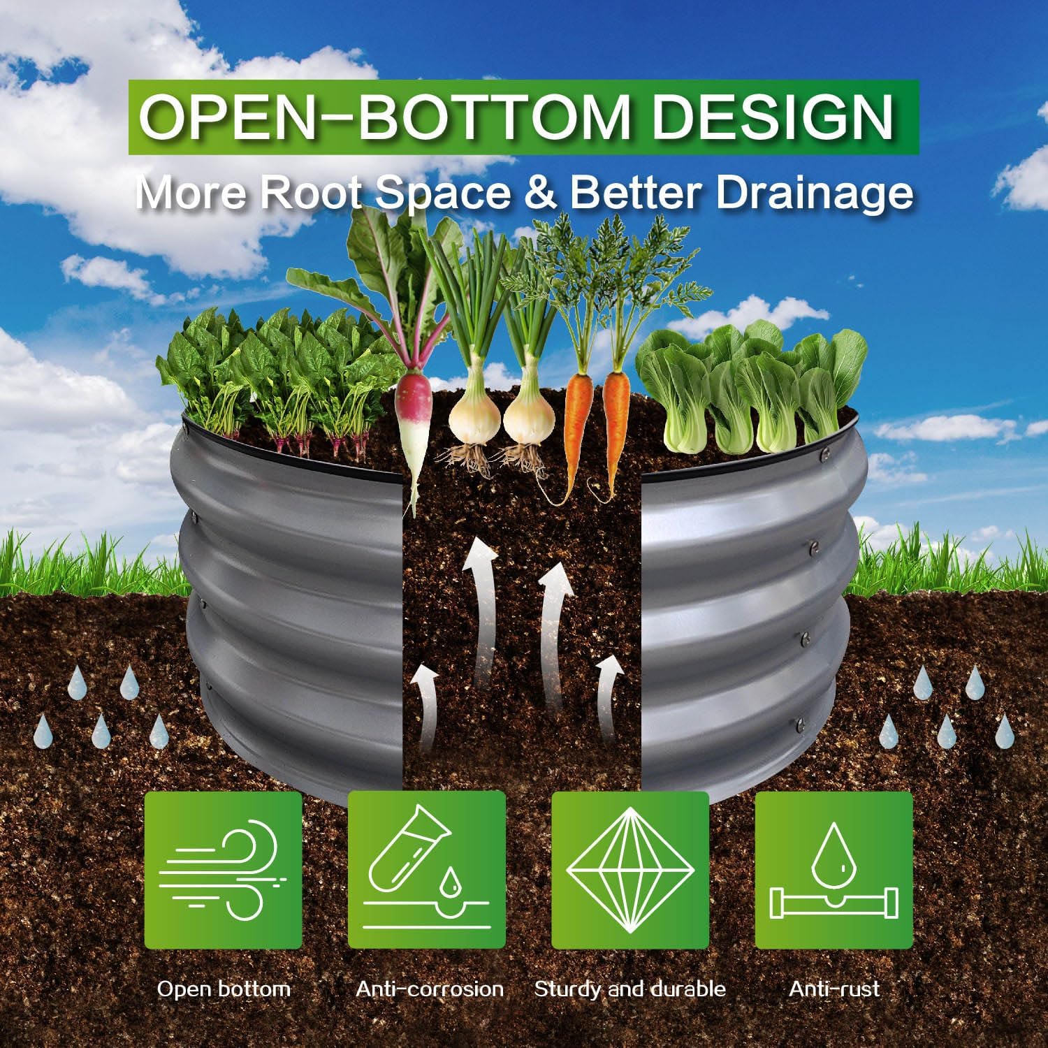 - OPEN BOTTOM DESIGN: GARDMAX galvanized planter raised beds are designed with an open bottom, which is good for drainage to protect plants, plant roots won't be sick from excessive water. It also keep weeds away from soil and keep out chicken, small pets like puppies, rabbits to protect your plants