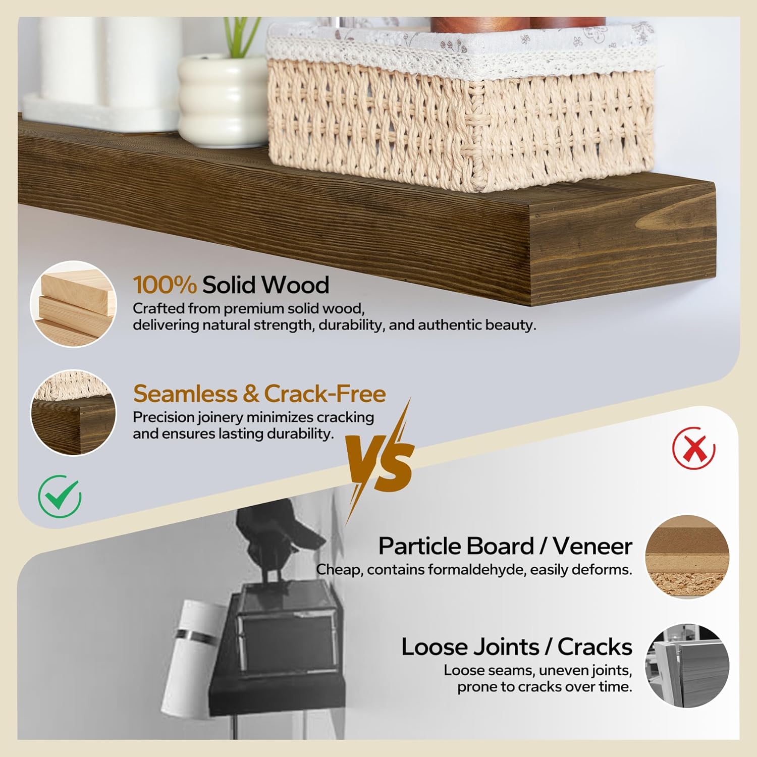 - Premium Handcrafted Solid Wood Shelves: Our floating shelves are made from 100% real solid pine wood, handcrafted to showcase the natural grain and unique knots of the wood. The rustic stain adds a timeless farmhouse charm, enhancing any home decor.