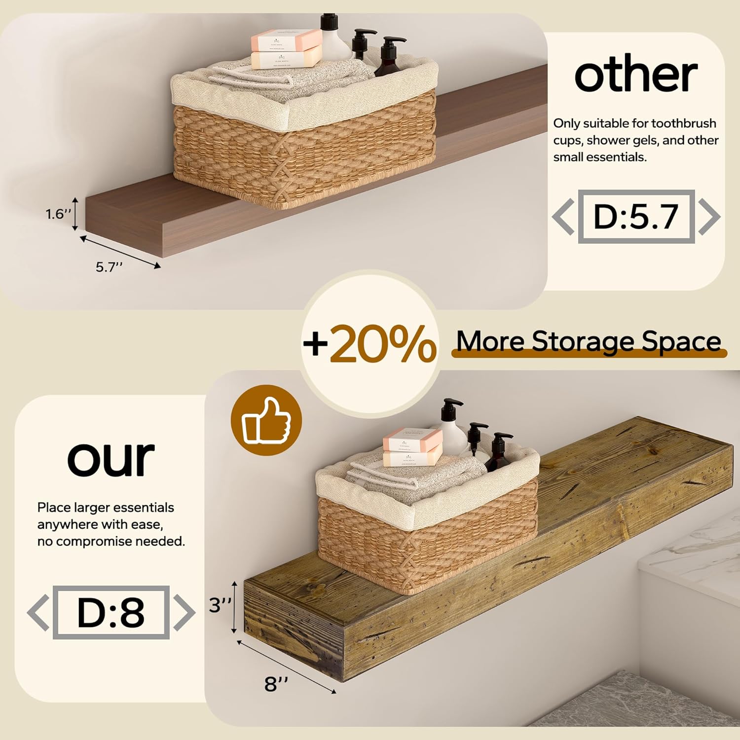 - Stylish and Versatile Storage Solution: Upgrade your living spaces with these 3'' thick rustic wood shelves, perfect for kitchens, bedrooms, bathrooms, living rooms, or offices. They combine rustic charm with modern functionality, serving as both decorative and practical storage.