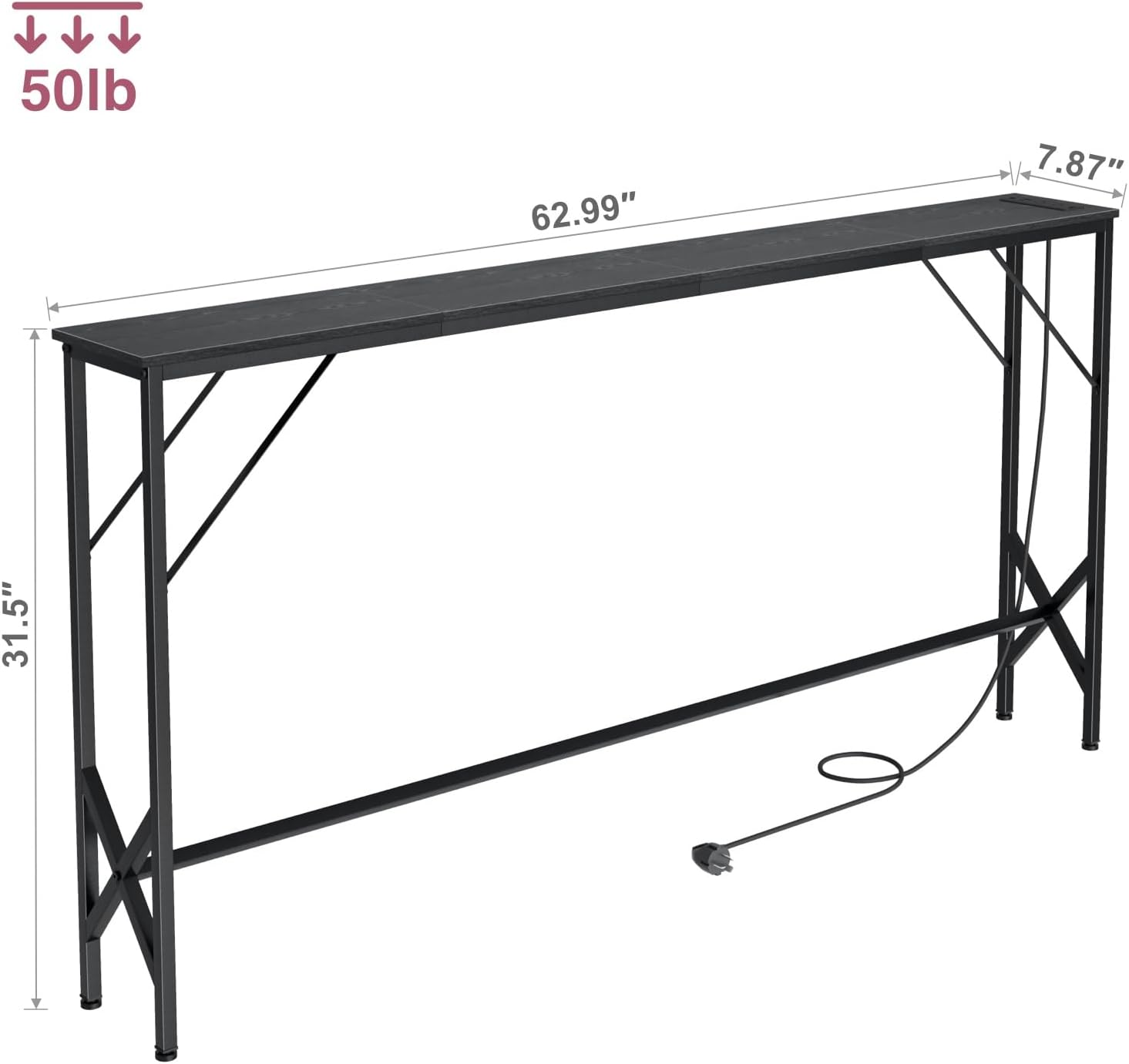 - 【CONSOLE TABLE WITH FAST-CHARGING STATION】---This size 7.9"D x 63"W x 31.5"H sofa table is equipped with 2 AC, 1 USB + 1 TYPE-C(5V 3A ) fast-charging ports, the power cord is 5 feet long, convenient to charge your mobile phone, computer, ipad.