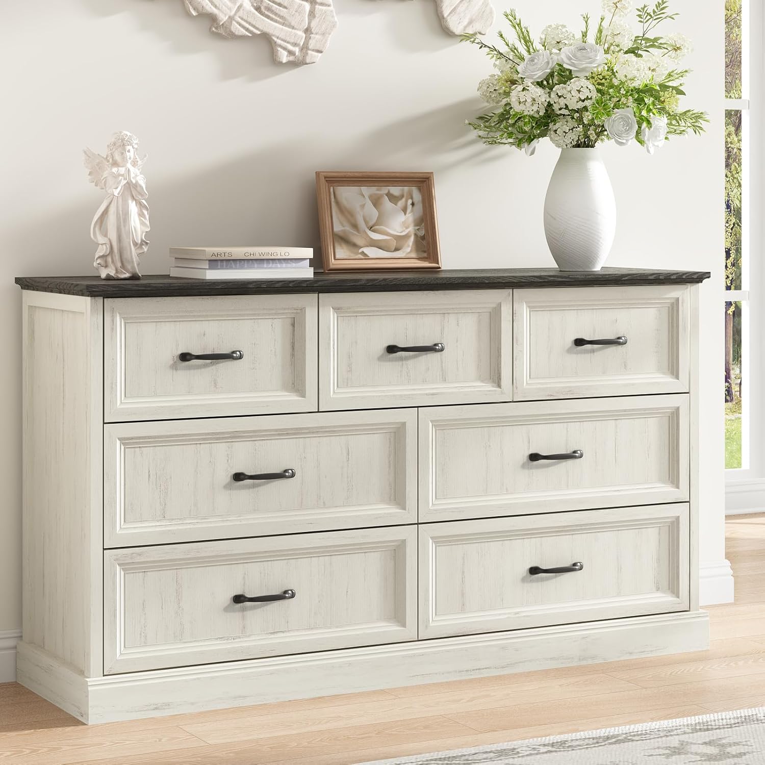 Farmhouse 7 Drawer Dresser for Bedroom, 55 Inch Wide Modern White Dresser TV Stand with Large Drawers & Bar Handles, Rustic Wood Chest of Drawers for Bedroom, Living Room, Hallway, Entryway.