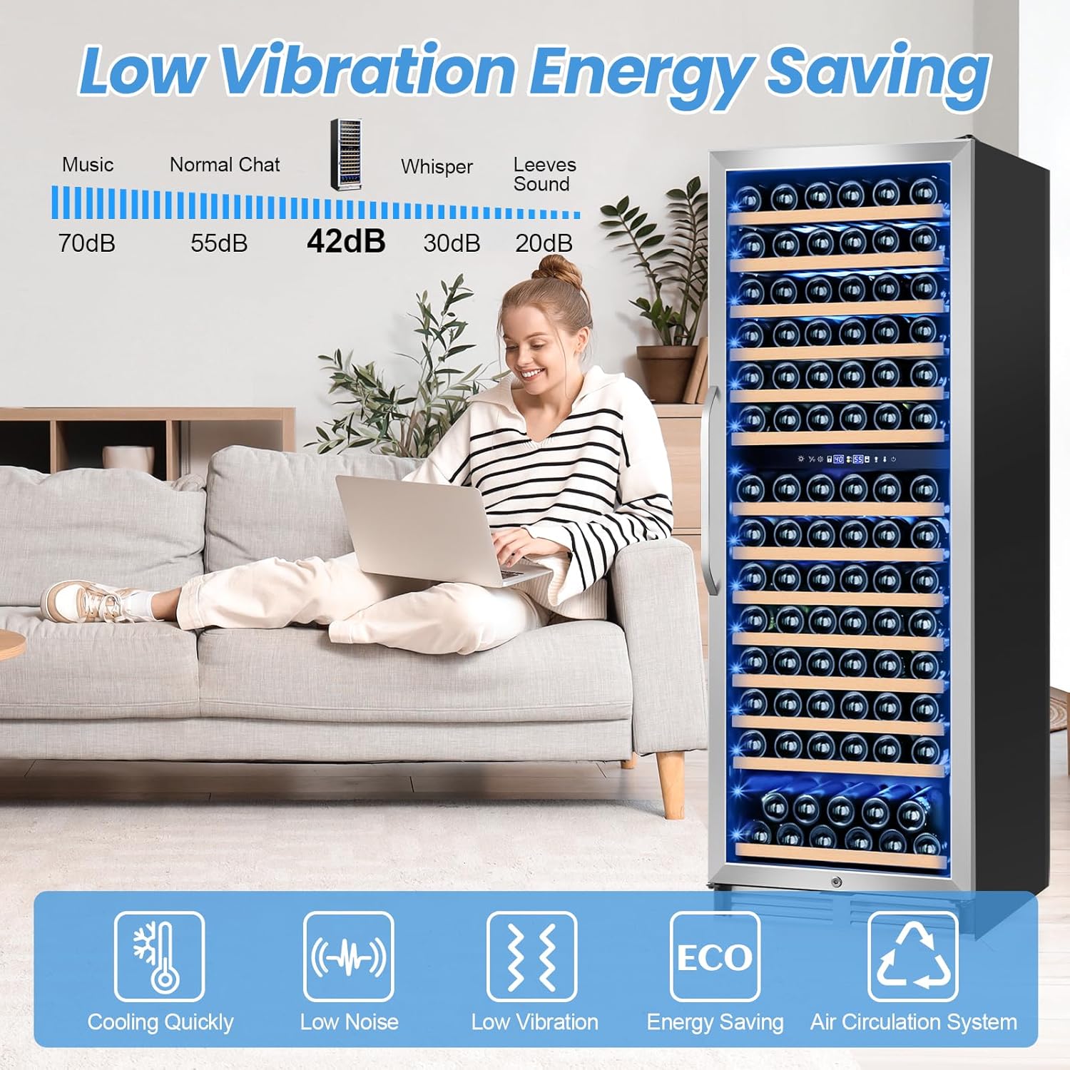 - 180 BOTTLES CAPACITY: This wine cooler boasts a generous capacity of up to 180 standard wine bottles, making it ideal for large collections. The adjustable, removable wooden shelves offer easy access and allow you to customize the storage layout to your preference, maximizing space efficiency.