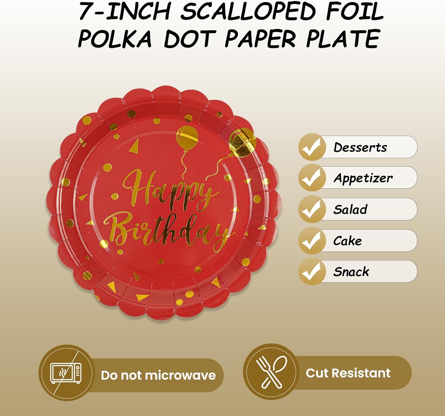 - 【FESTIVE BIRTHDAY PARTY SUPPLIES】: Red birthday party plates set comes with 50pcs red paper plates, serve up to 50 guests, specifically for dessert plates size: 18cm/7inch, small but definitely sturdy enough to serve dessert, cake, appetizers and other party foods, gold foil paper plates are exquisite and generous, it's a must-have finishing touch to your birthday dinner!
