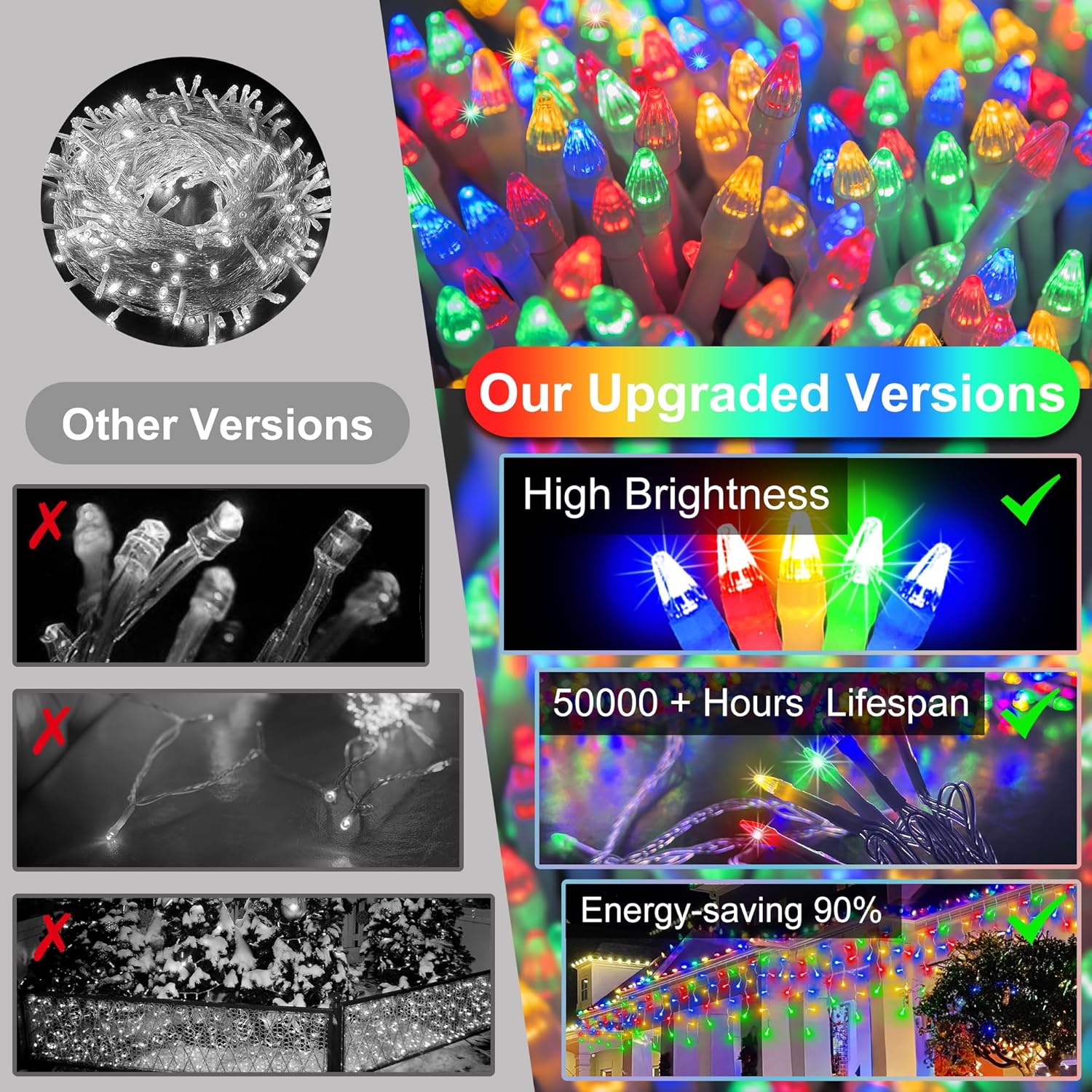 - Bright, Green, and Kid-Friendly:Our multicolor Christmas decrations are designed with low-voltage LED technology, making them safe for homes with children, pets, or delicate décor. These energy-efficient LEDs stay cool to the touch. With a long lifespan and lower power consumption, they brighten your home while keeping electricity costs down. Indoors or outdoors, these multicolor lights bring both beauty and safety to your holiday season