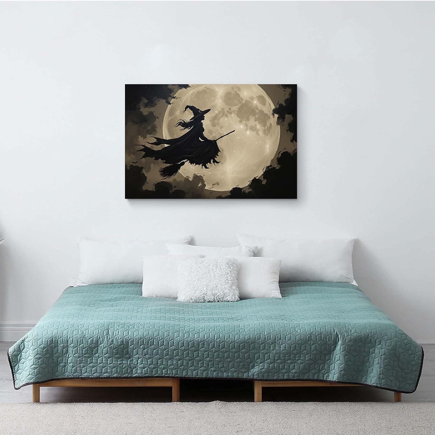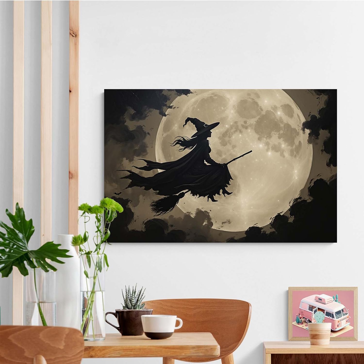 Full moon witch silhouette poster witch on magic broom Halloween mural poster decorative mural art suitable for home living room bedroom24x36in Wood Framed