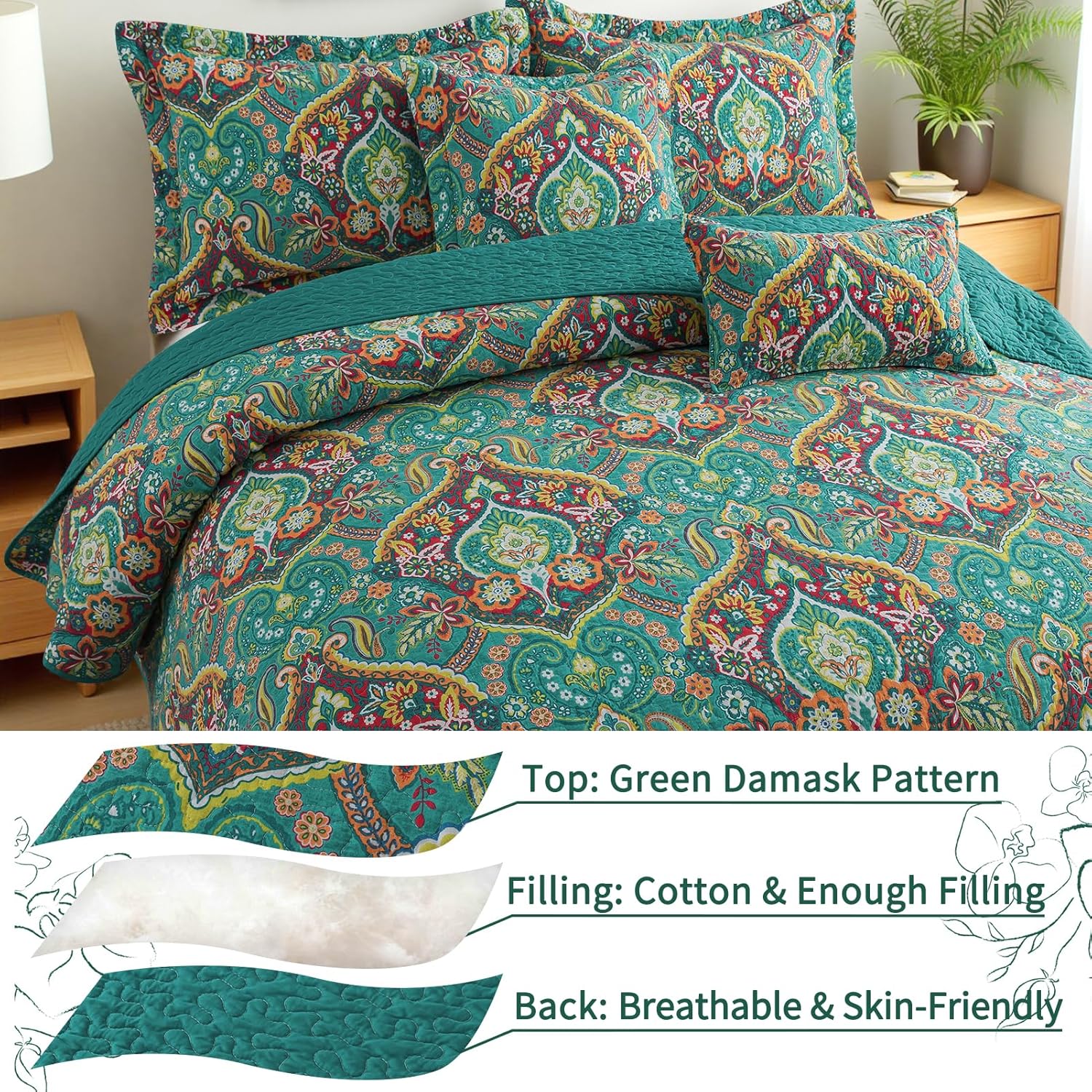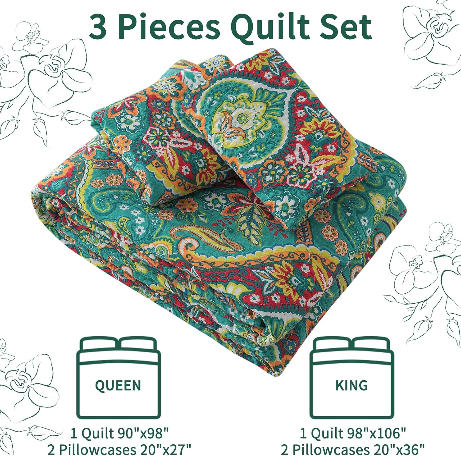 - 【3-Layer All-Season Comfort】 Cotton queen quilt set is composed of three layers, floral bedding woven cover, inner cotton filling, and solid color woven backing. Three layers of farmhouse queen size quilts for bed are stitched together with fine handwork, trapping warmth in winter and breathable in summer for year-round coziness.