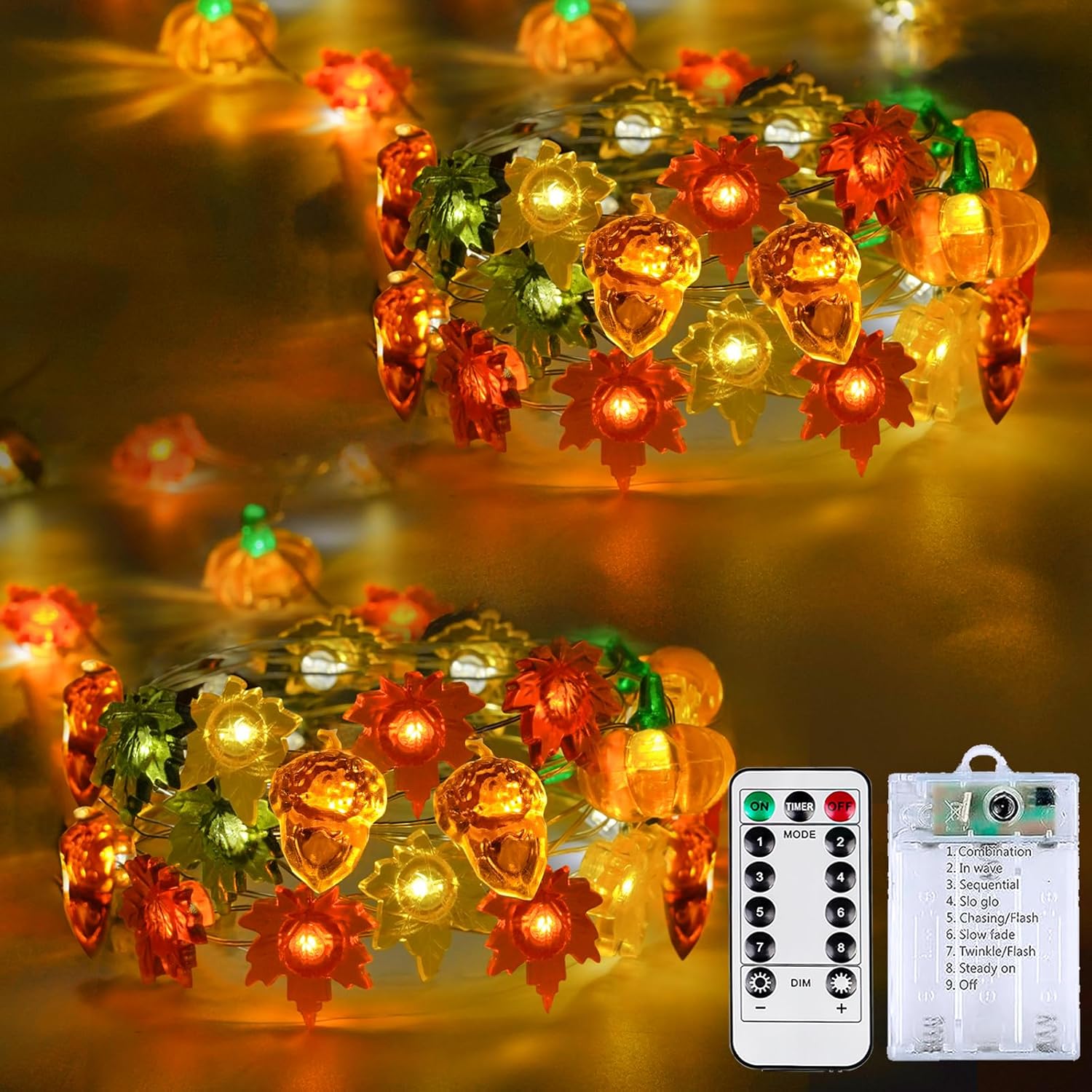 2 Pack 60LED Fall Decoration 3D Pumpkin Acorn Maple Leaf String Light Battery Operated, 20FT Fall Lights with Remote, Waterproof 8 Modes Fairy Lights for Autumn Harvest Thanksgiving Halloween Decor
