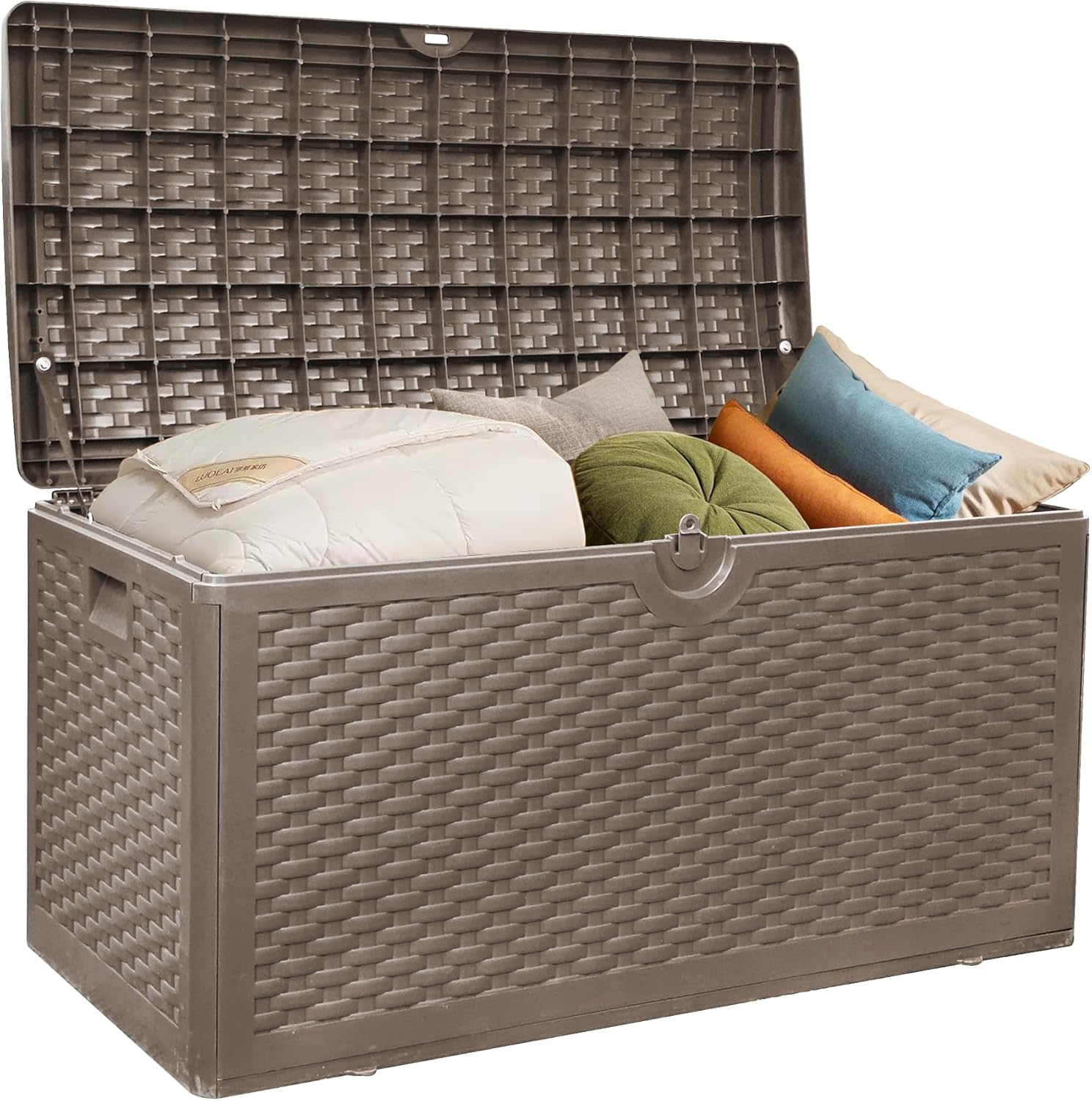 - Built to withstand any weather, our deck box is made from resin that offers waterproof, corrosion-resistant protection, and UV-resistant. No matter the season—be it scorching sun or heavy rain—this box will keep your items dry .