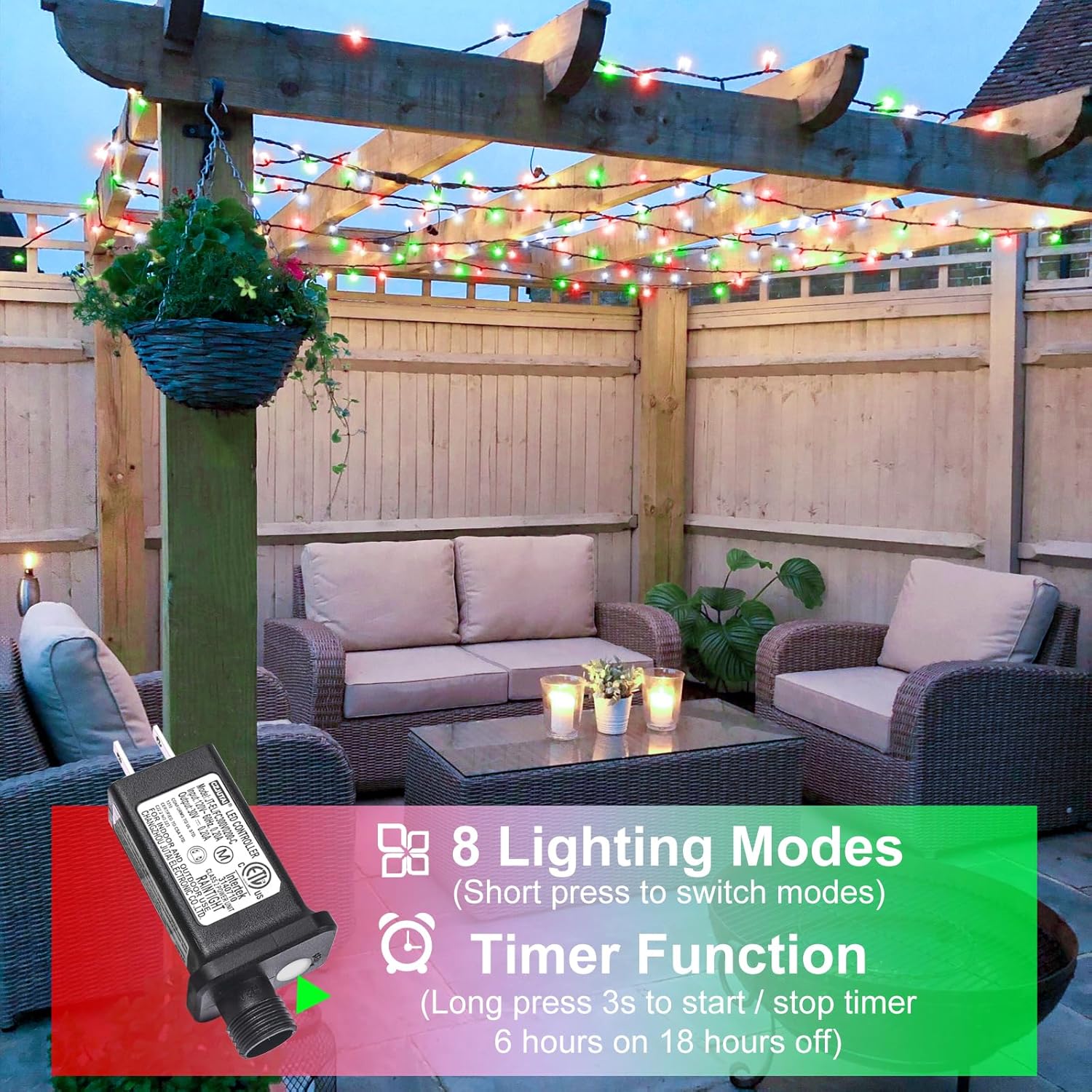 - 【8 Lighting Modes】: This string lights has 8 different lighting modes to choose from: combination, in waves, sequential, slog-glo, chasing/flash, slow fade, twinkle/flash, steady on. Press the button on the adapter to change the flashing modes. Moreover, built-in memory chip will save your last mode setting.