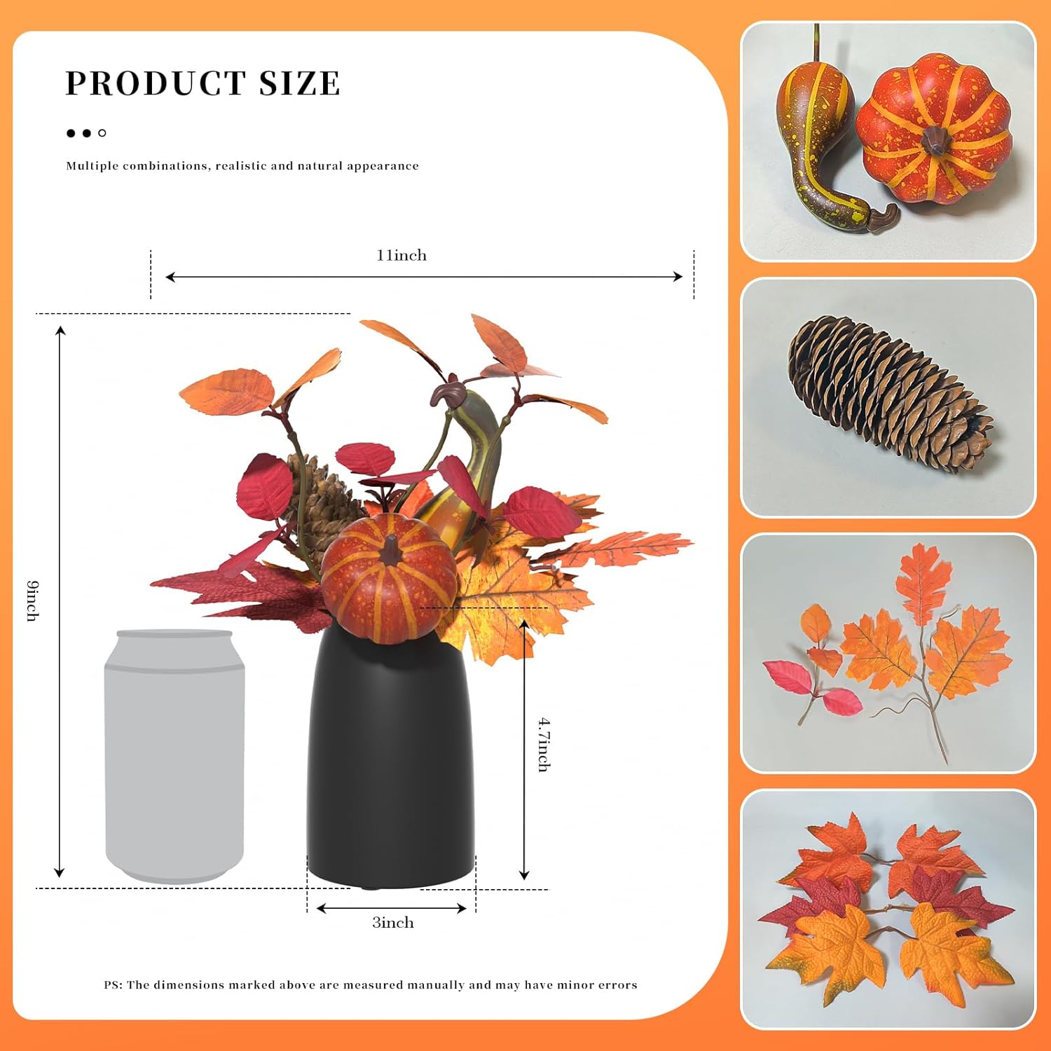 Autumn Artificial Potted Plant Decorations, Maple Leaves, Pinecones, Pumpkins with Black Ceramic Vase for Home,Thankgiving Table Decoration