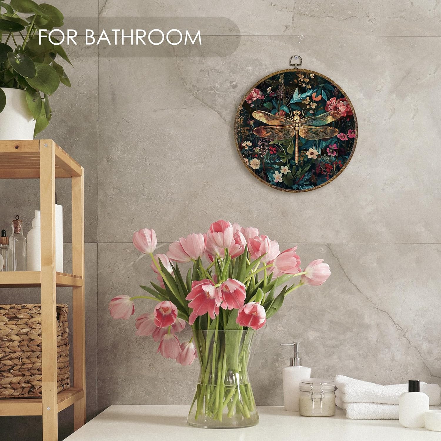 Fewgb Vintage Dragonfly Round Wall Art Decor Framed for Gallery Bedroom Living Room Kitchen Bathroom, Dark Black Floral Canvas Wall Art Prints Picture, Flower Hanging Room Decor Artwork 10x10