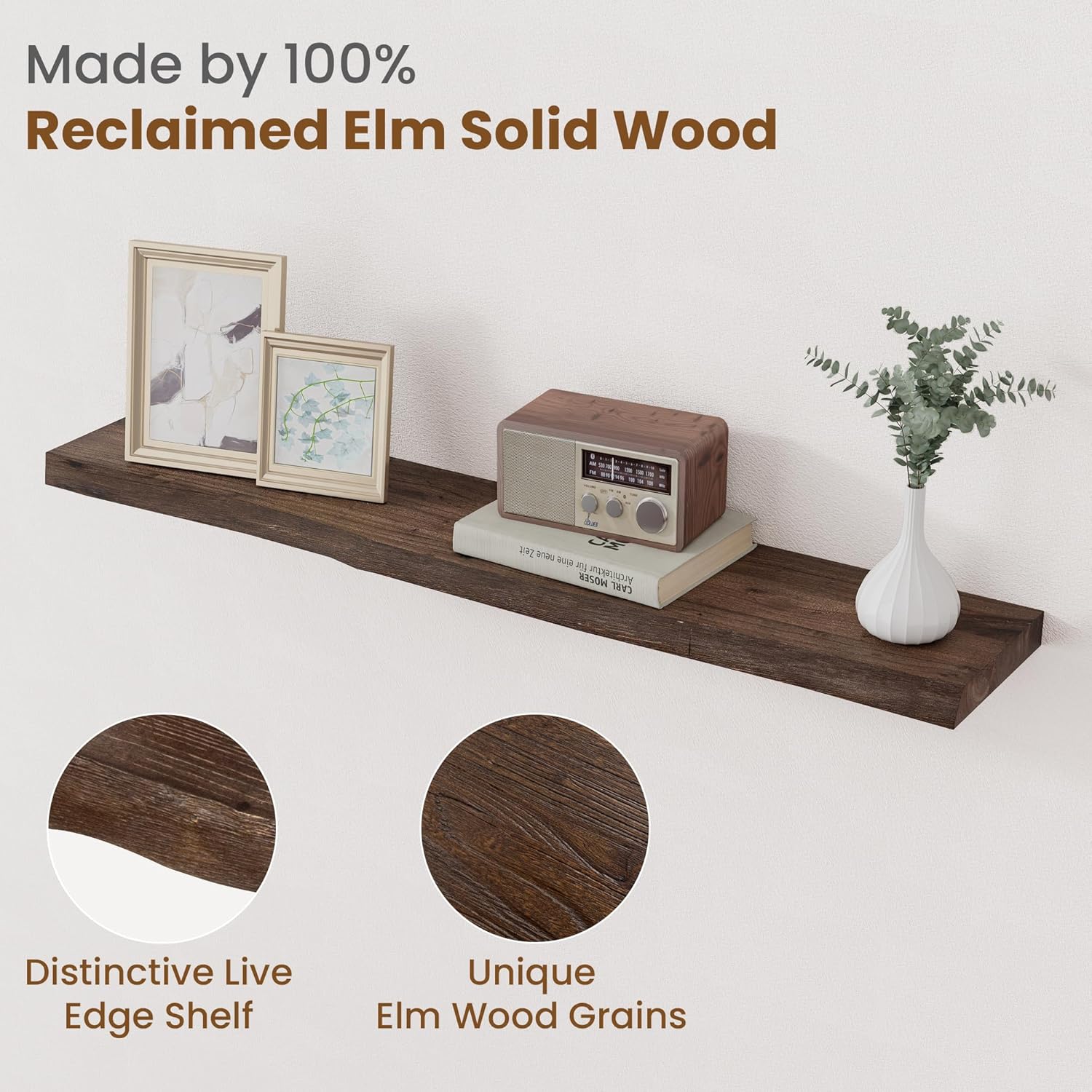 - Solid Elm Wood: Our rustic live edge floating shelves are made of reclaimed elm wood, each floating shelf has a unique natural grain, color, holes, and knots. Don't worry about holes and knots, these are elm itself so you can feel the feeling of nature