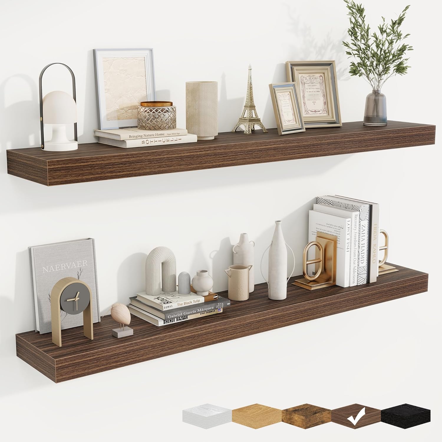 - Well-designed Floating Shelves: Our floating shelves for wall are made of premium engineered wood with a realistic wood grain finish. The rustic wood grain adds warmth and character to any modern or traditional interior. It can organize everyday clutter and make your space tidier, and make it full of aesthetic flare