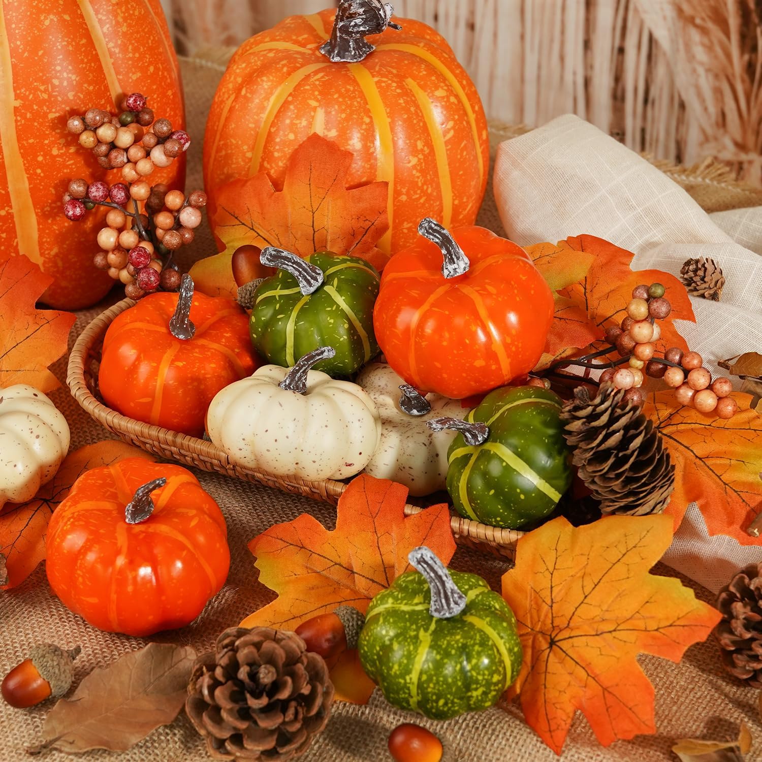 - There are pumpkins, gourds, acorns, pine cones, maple leaves and berries in the different shapes and colors, which can enrich and beautify your table decoration.