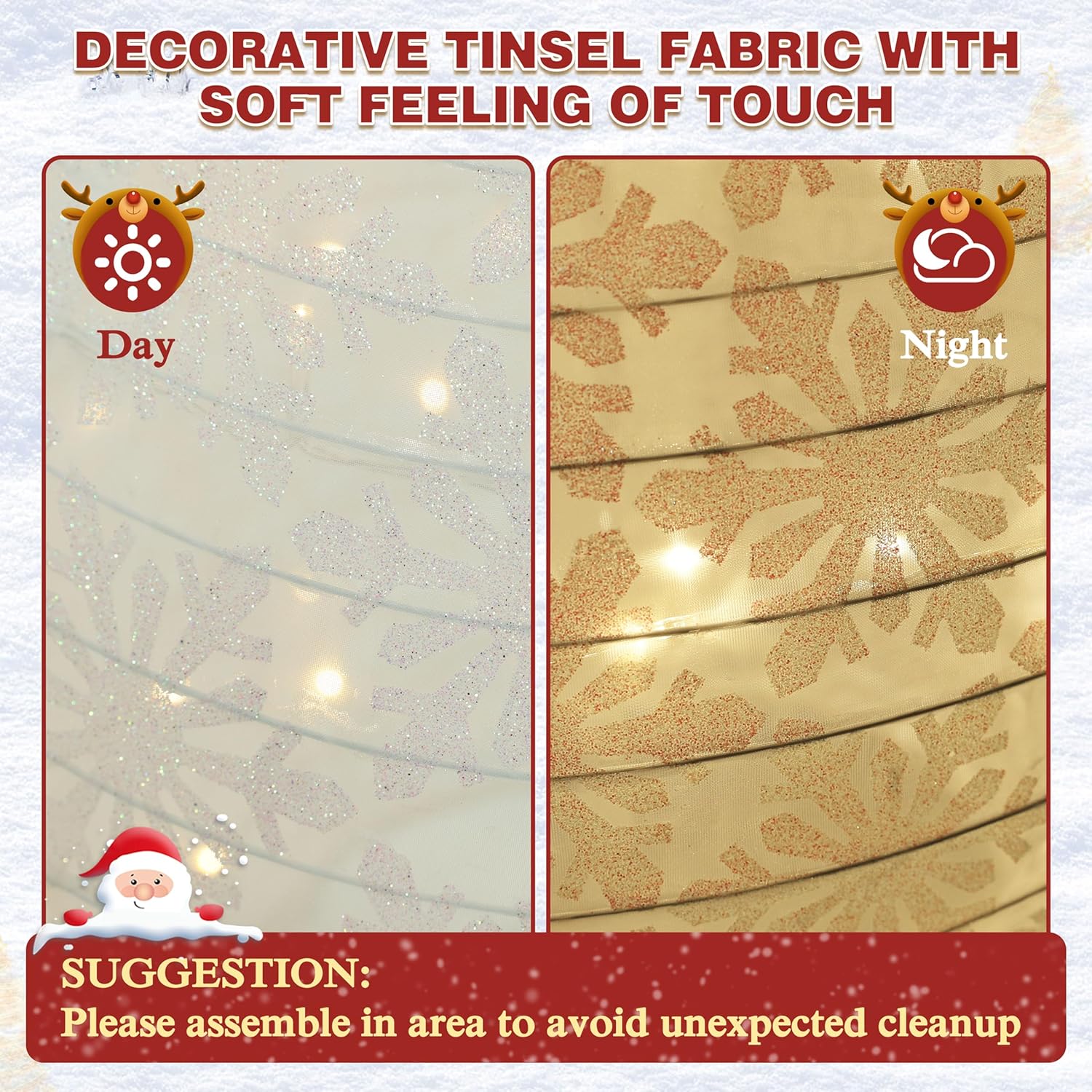 - Premium Quality: Our lighted Christmas decoration is made of a high quality powder-coated steel frame which ensures the long service life. It is durable enough for you to use year over year and it wouldn’t break easily. Decorative tinsel fabric gives you soft feeling while touching it