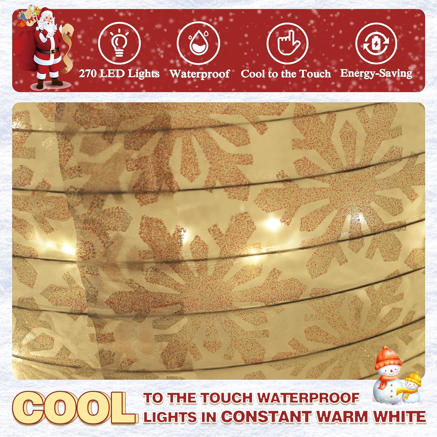 - Weather-Friendly Design: This freestanding holiday display is equipped with water-resistant cord and lights, the light bulb is waterproof and snow proof, so you don't have to worry about safety issues. Although, it has 270 LED lights, it’s still energy-saving. Besides, pre-strung fairy lights remain cool to the touch in constant warm white