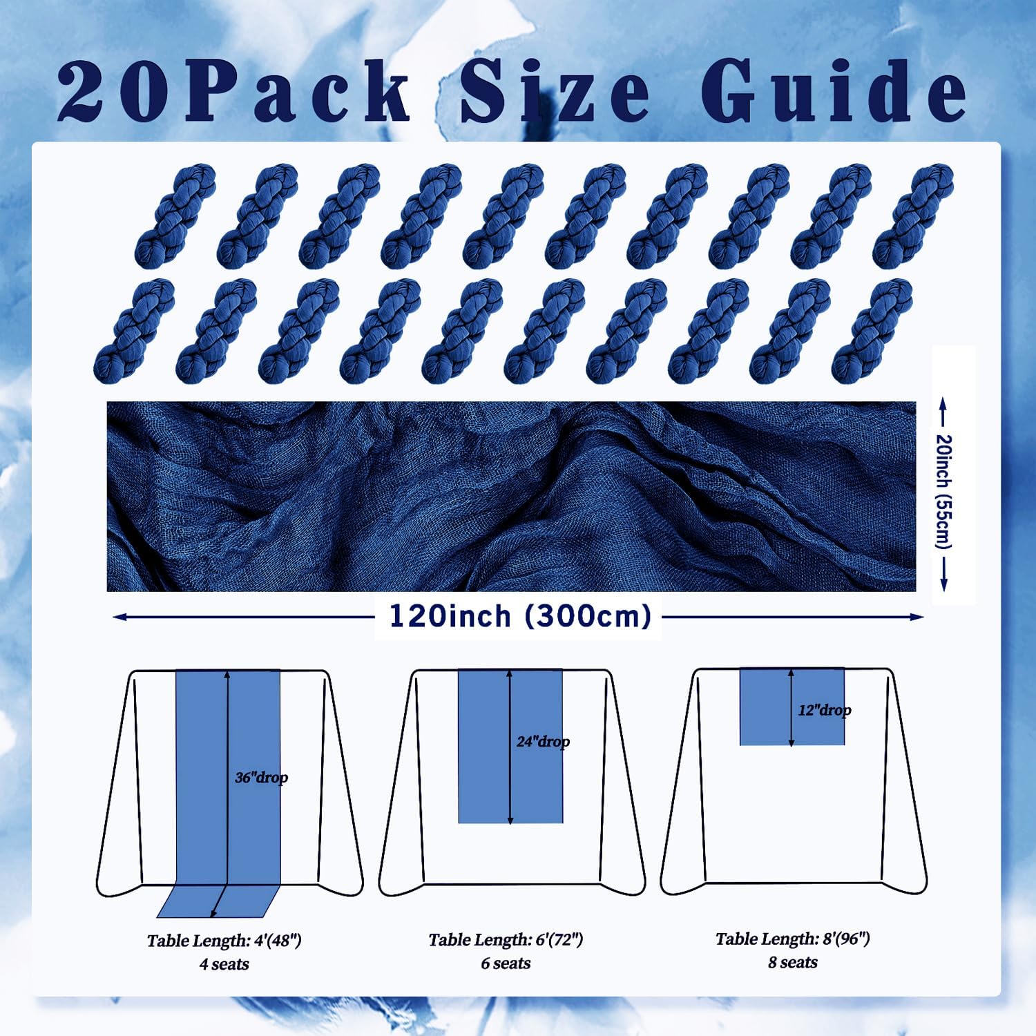 - Cheesecloth Table Runner Size: You will receive 20 royal blue cheesecloth tablerunner, each measuring 20 x 120 inches. The quantity is sufficient for you to decorate various romantic occasions. It can decorate most shaped tables, such as rectangular tables, round tables, and cocktail tables. It is long enough to decorate a large table and be placed perfectly and elegantly on the tabletop, adding a romantic atmosphere to your occasion.