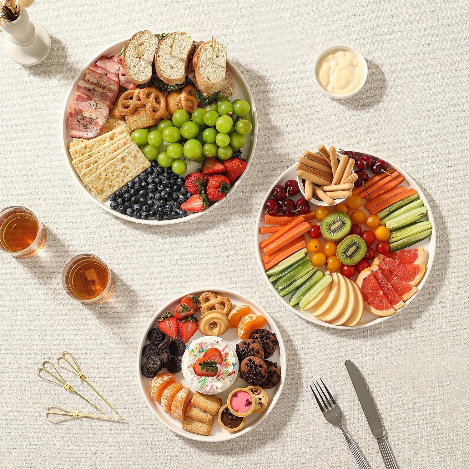 3 Packs Serving Platters, Large Serving Tray, Round Platters for Serving Food, Food Tray for Veggie Fruit Snack Dessert Cheese, White Ceramic Serving Trays for Party, Entertaining, 12.8”/10.8”/8.8”