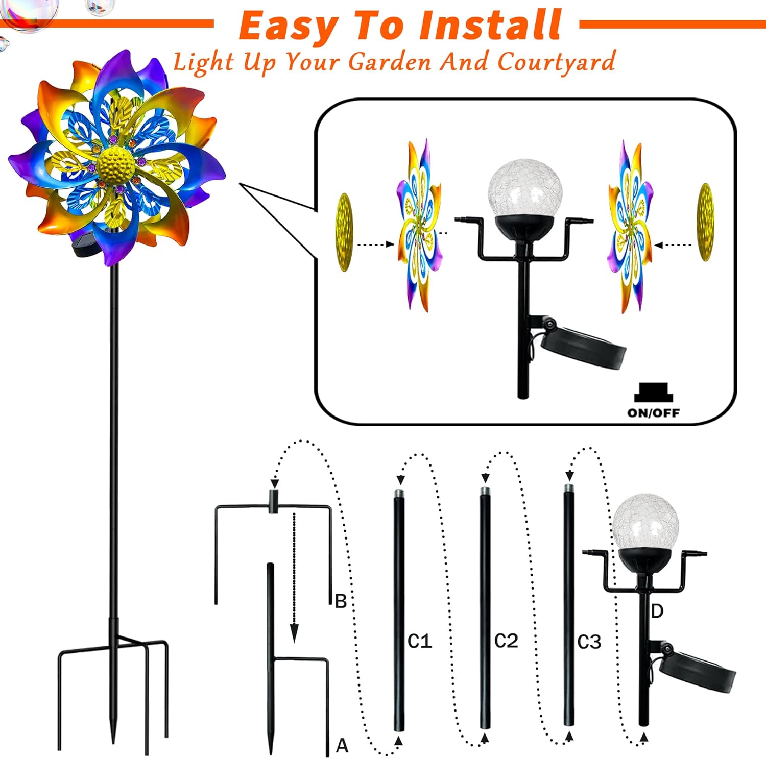 - Vibrant Double-Sided Solar Design: Our 60-inch Solar Wind Spinner Outdoor captures sunlight by day and glows elegantly at night, transforming your garden into a mesmerizing display. Perfect as yard decorations outdoor, these kinetic wind spinners outdoor add dynamic color and movement to any space.