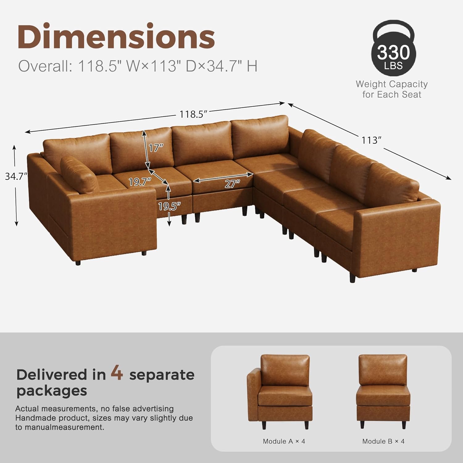 118.5" Faux Leather Modular Sectional Sofa, U Shaped Couch Set for Living Room, Large 8-Seater Comfy Cloud Couches with Storage Seat DIY Combination - Brown