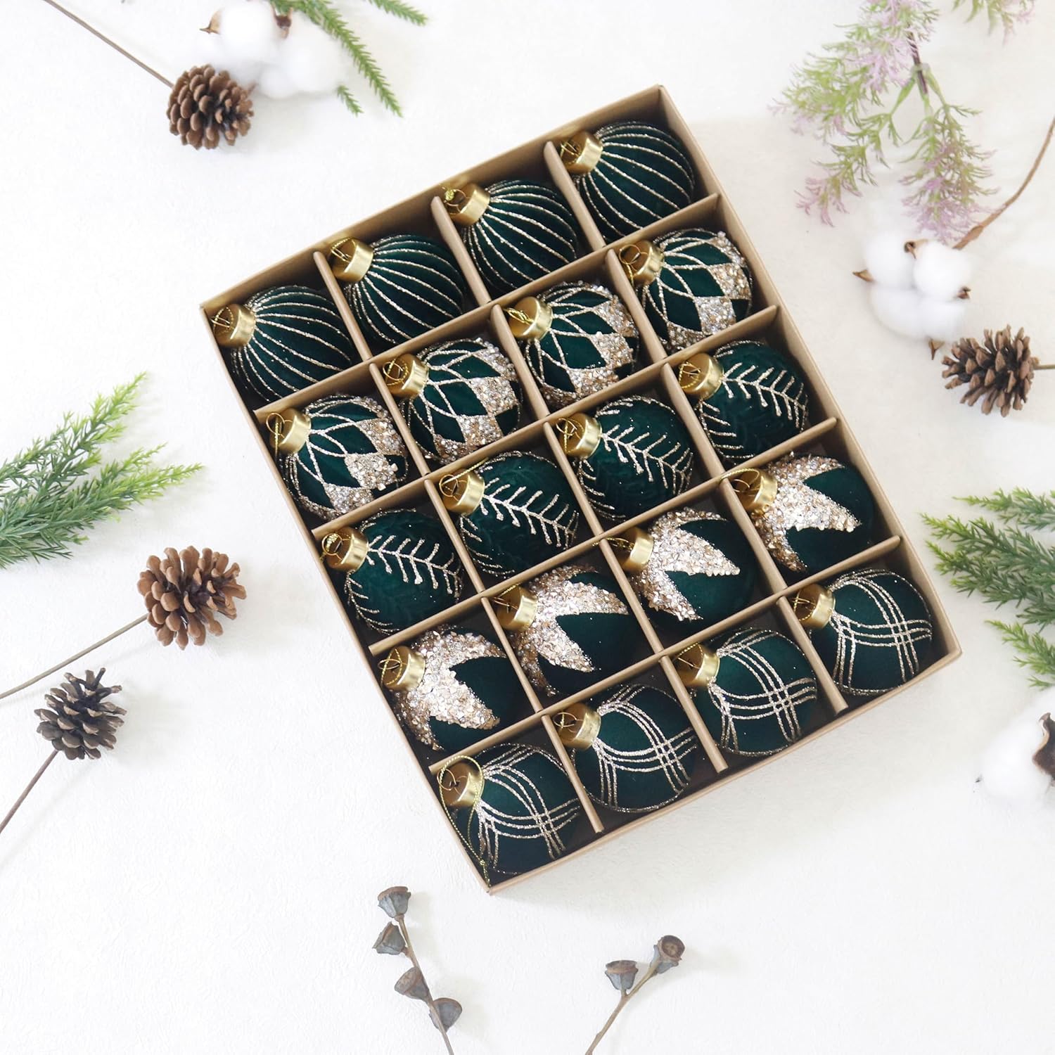 - Package List:the package contains 20PCS of flocked Christmas ball ornaments with glitter,2.36inches in diameter,solid color packed to choose,nice texture can fully meet your needs for decorating