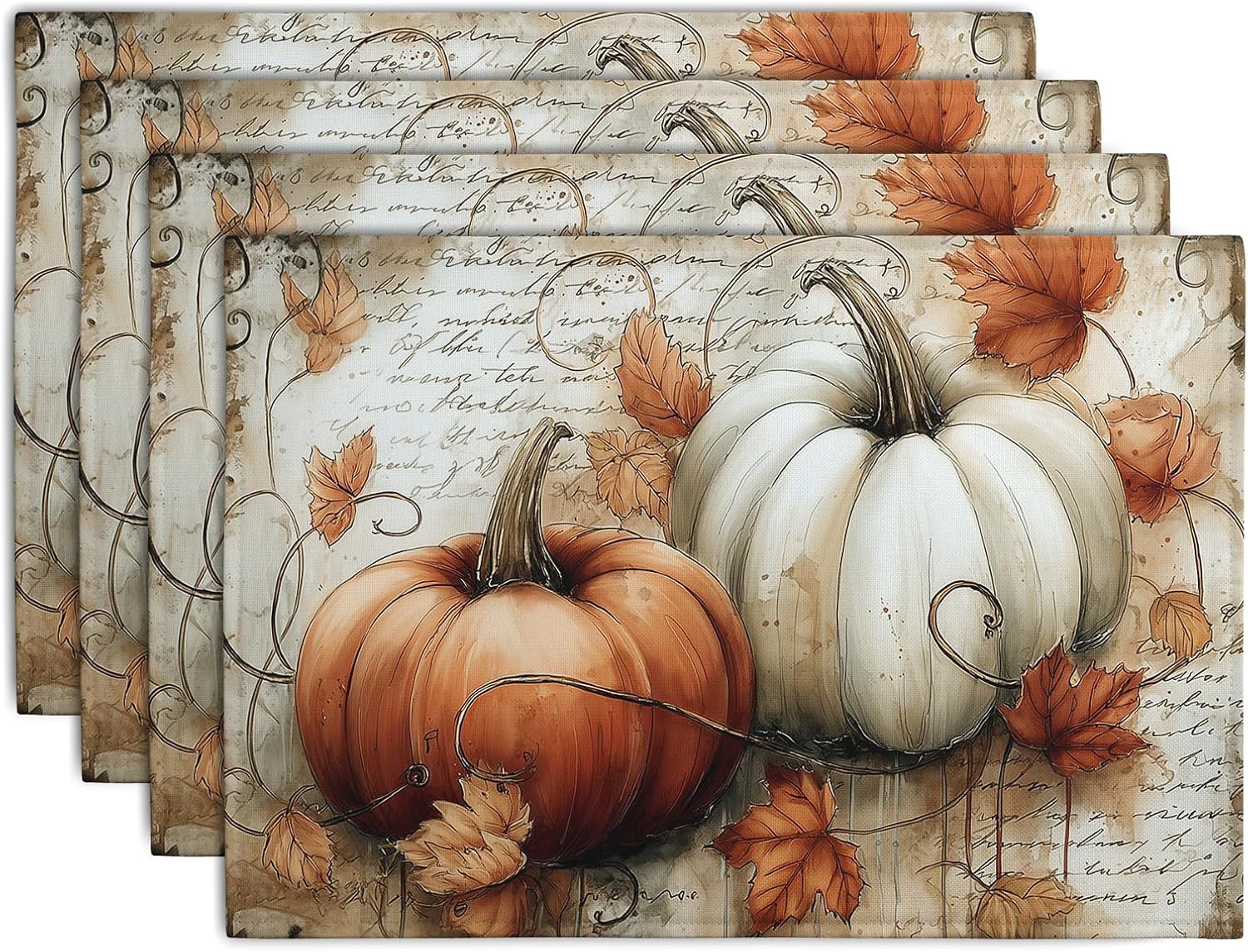 Fall Vintage Pumpkin Leaves Placemats Set of 4 Autumn Thanksgiving Harvest Linen Dinner Place Mats 12x18 Burnt Orange and White Rustic Farmhouse Decorative Kitchen Table Mats