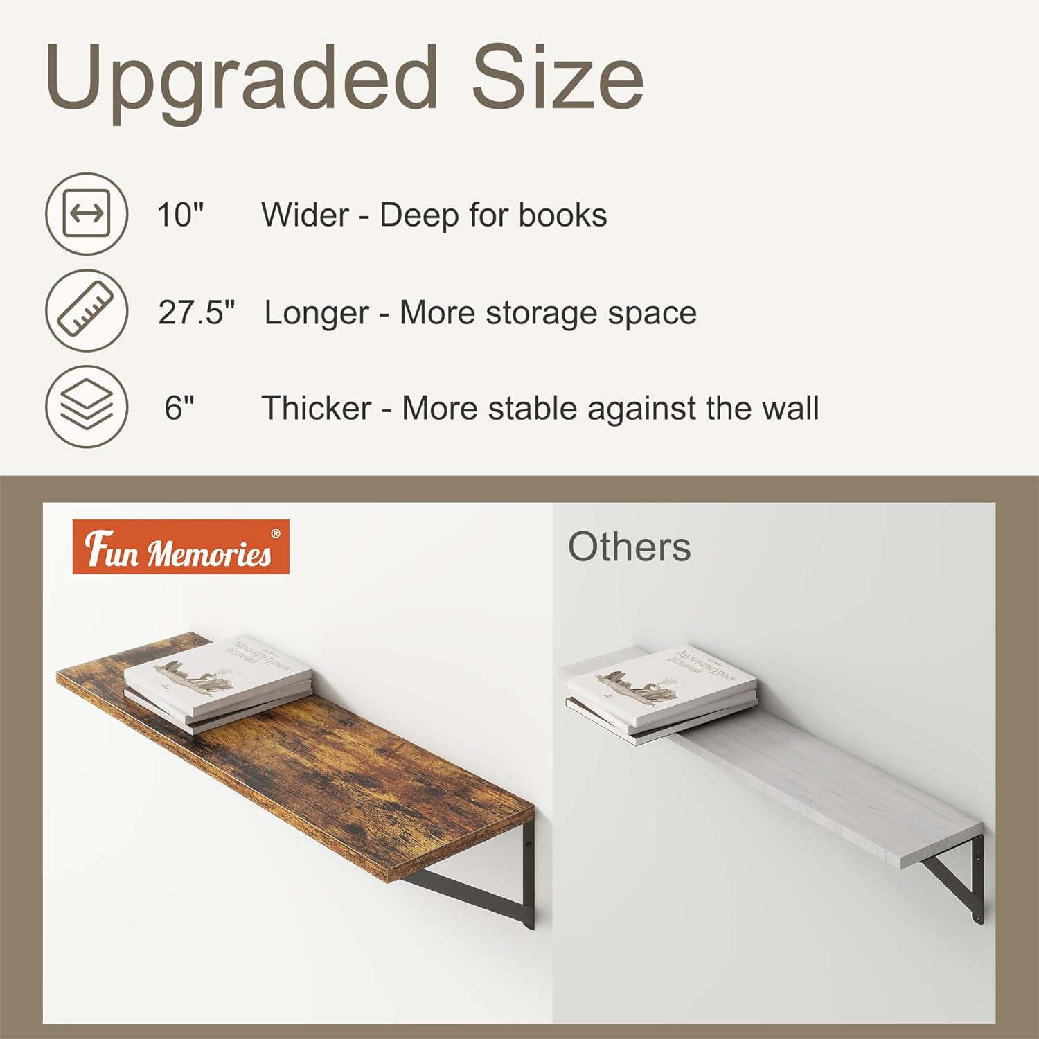 - ă10 INCH DEEP FLOATING SHELFăThis extra deeper and wider wall shelves are 10 inches in depth and 27.5 inches in length instead of the regular narrow floating shelves, you can put photos, pictures, DVD players, videos, books, toys, and some other knickknack on this beautiful display wooden shelf.