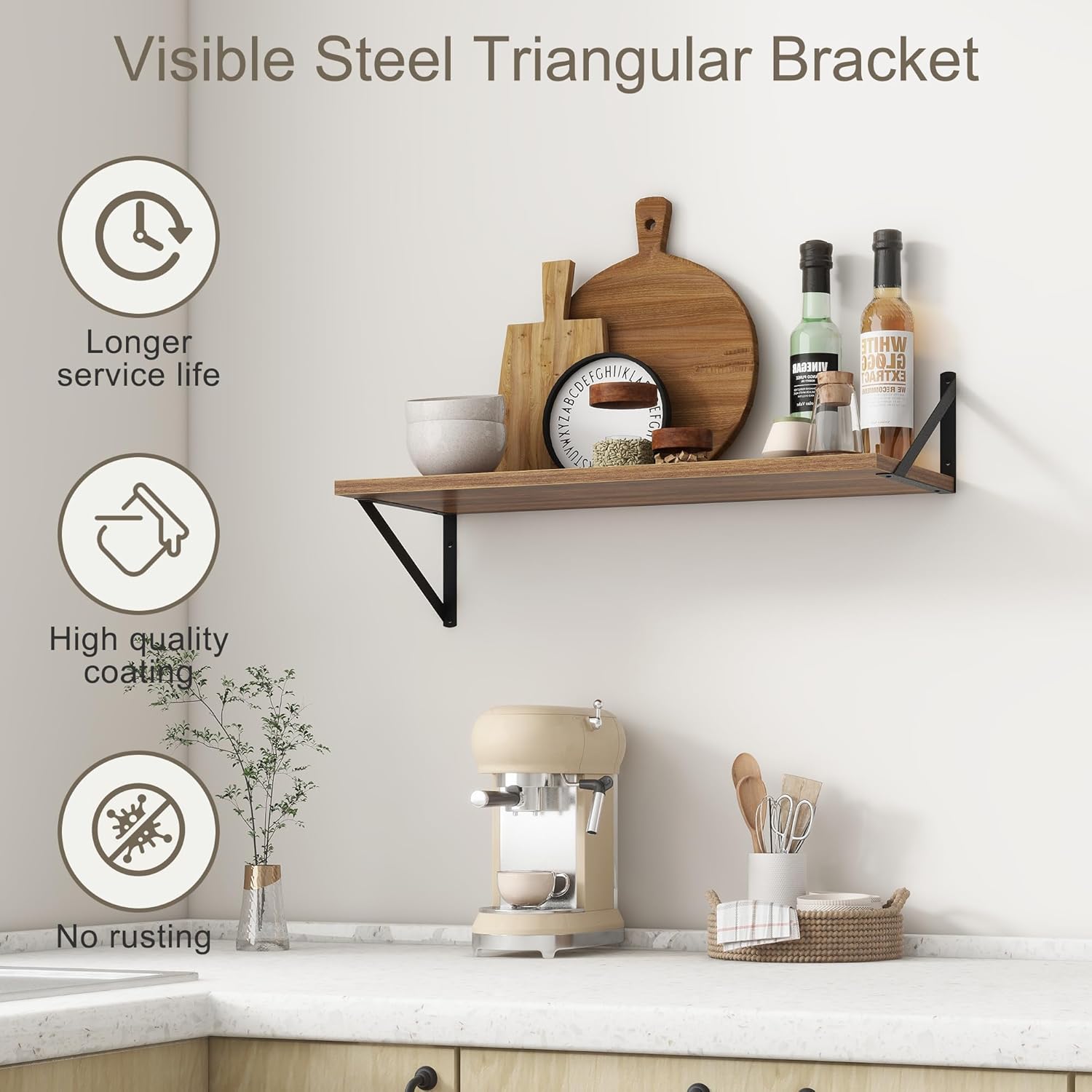 - ăFARMHOUSE RUSTIC WALL SHELFăThese floating shelves are made of premium engineered wood board and visible triangular bracket. The rustic wooden grain surface add character and warmth to any modern or traditional interior with these deep floating shelves, contrast shelves at staggering heights on the wall or mount side-by-side or in the corner for a clean streamlined look.
