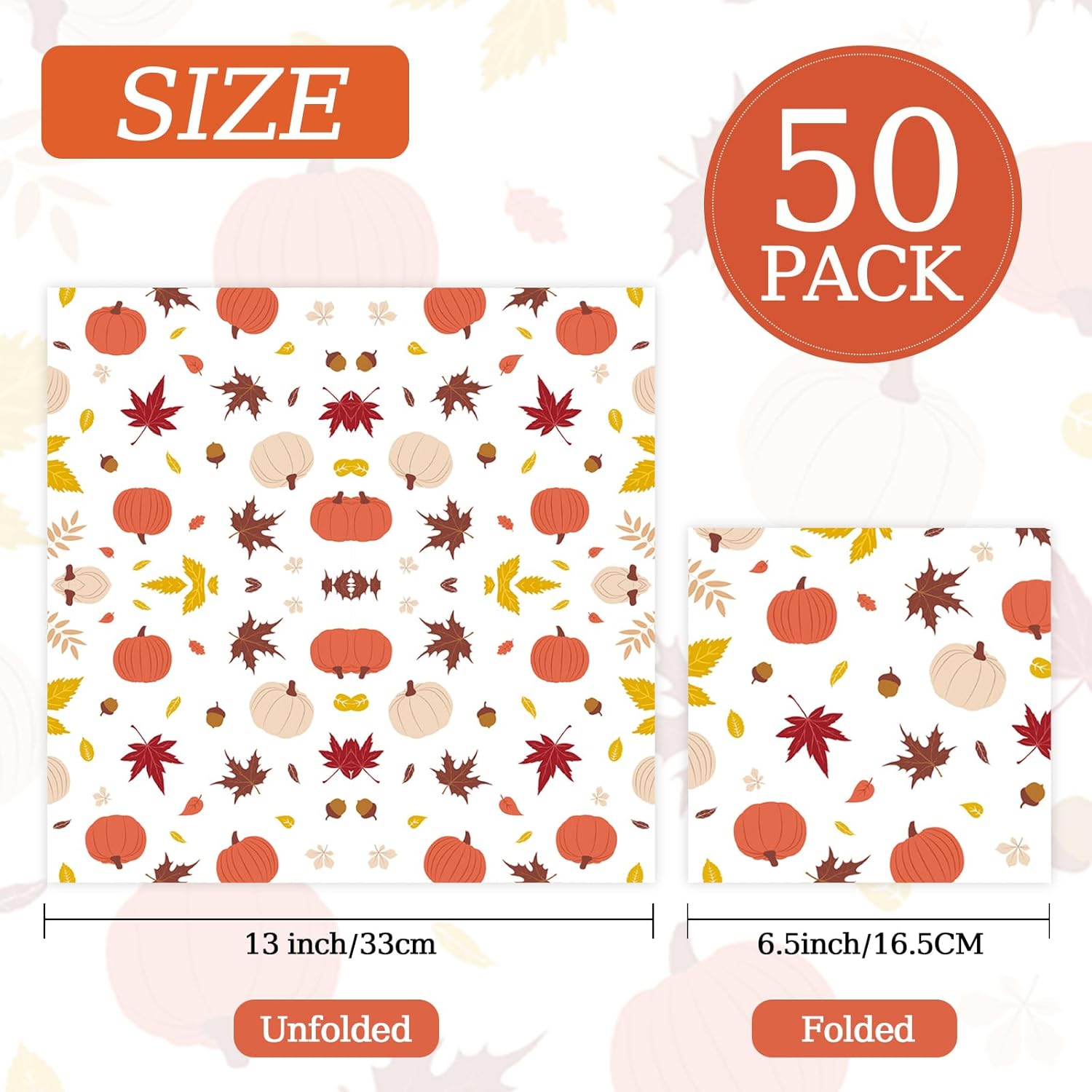 - š½Package Includes: This package contains 50 pieces of fall-themed paper luncheon napkins. The elegant autumn patterns, featuring pumpkins and leaves, bring a festive touch to your gatherings while providing ample quantity for your needs.