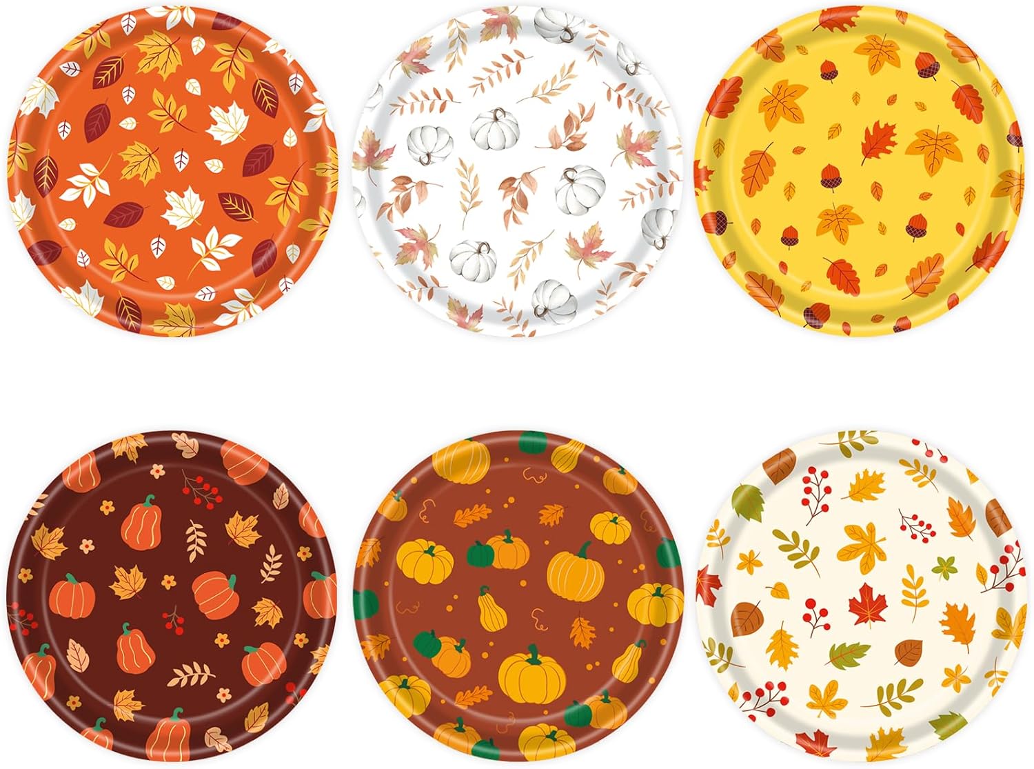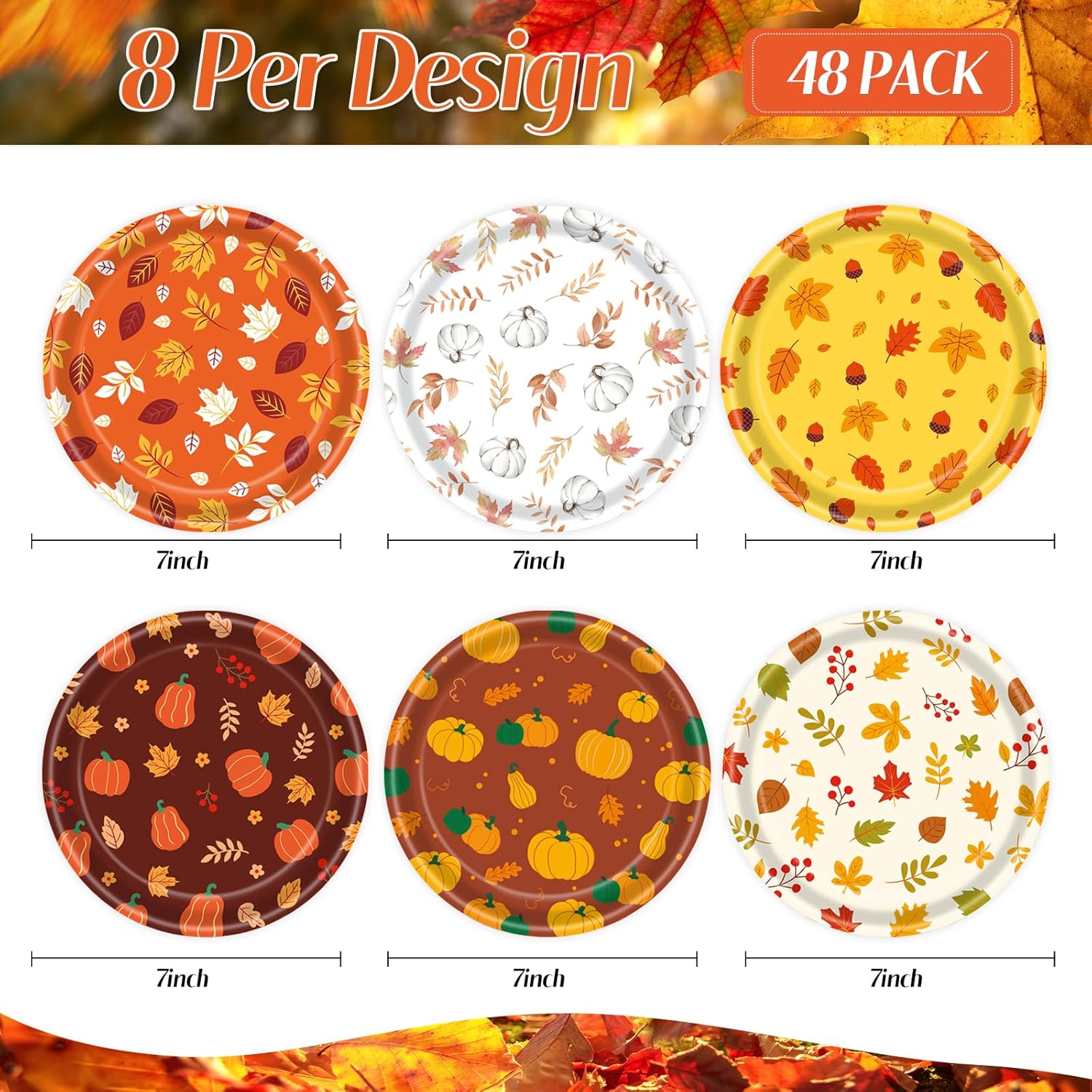 - đăPackage Includesă You'll receive 48 festive fall-themed paper plates, perfect for autumn gatherings. Each set features 6 unique designs, with 8 plates per design, adding variety to your table setting.