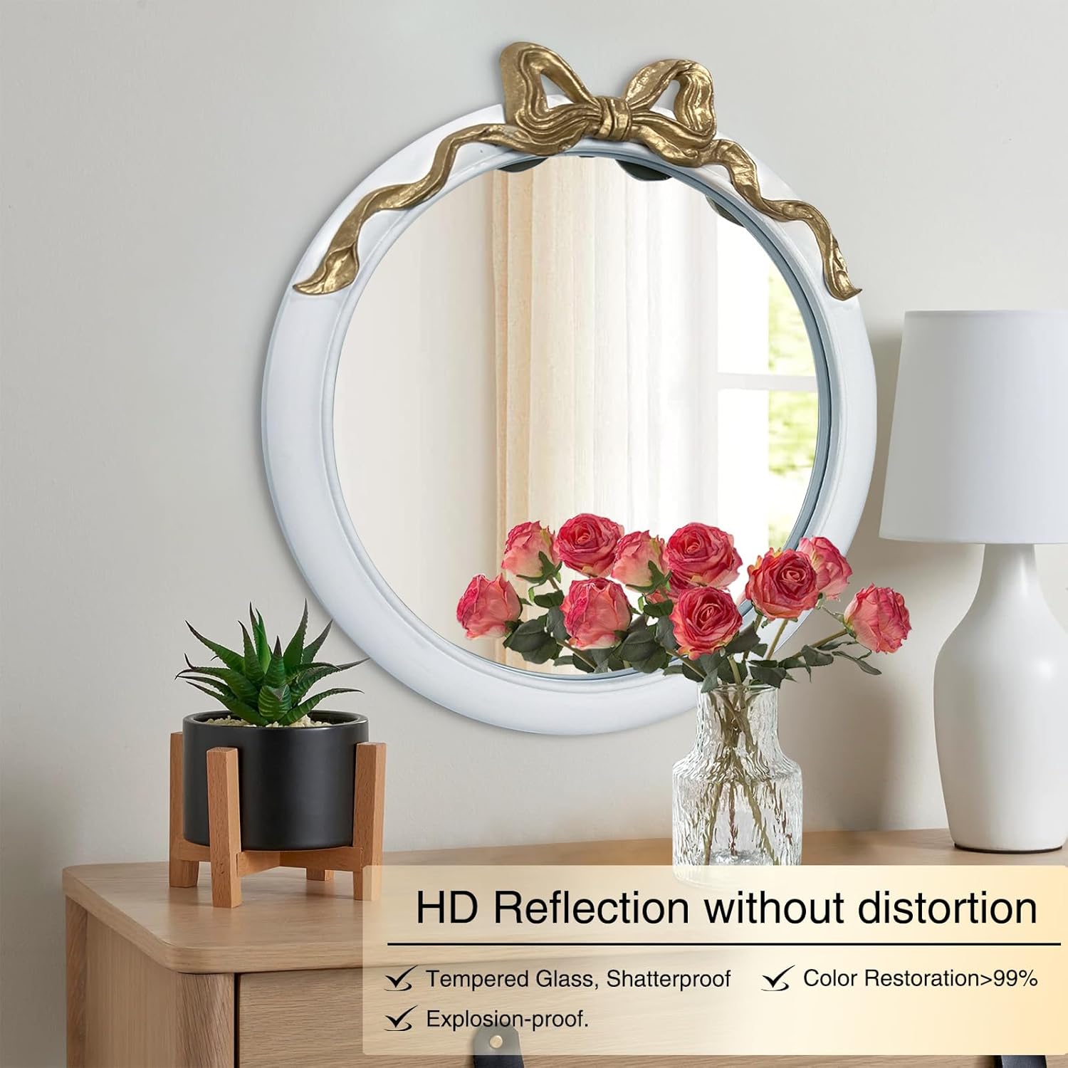 - 【Tempered HD Glass】Our gold and white wall decorative mirrors feature 5mm tempered glass with advanced 5-layer floating technology. These circle mirrors for wall decor deliver exceptional clarity with a 90 CRI rating and fog-resistant surface. The shatterproof design makes this mirror for girls room both safe and sophisticated.