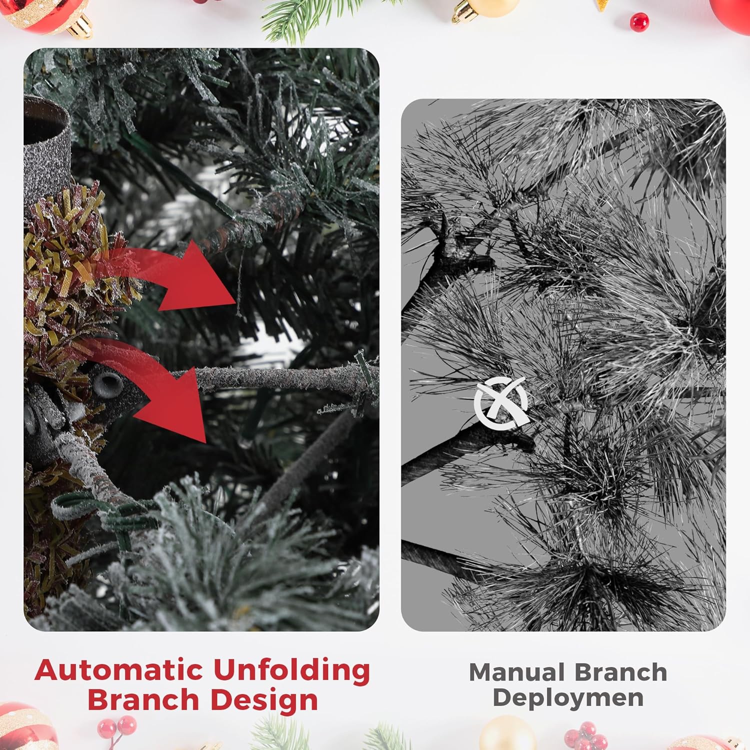 - Frosted Elegance:Experience the charm of a winter wonderland with our Christmas tree. Its lush green branches are beautifully enhanced by a delicate dusting of artificial snow, presenting a captivating frosted effect that brings a magical seasonal ambiance to your holiday setting.