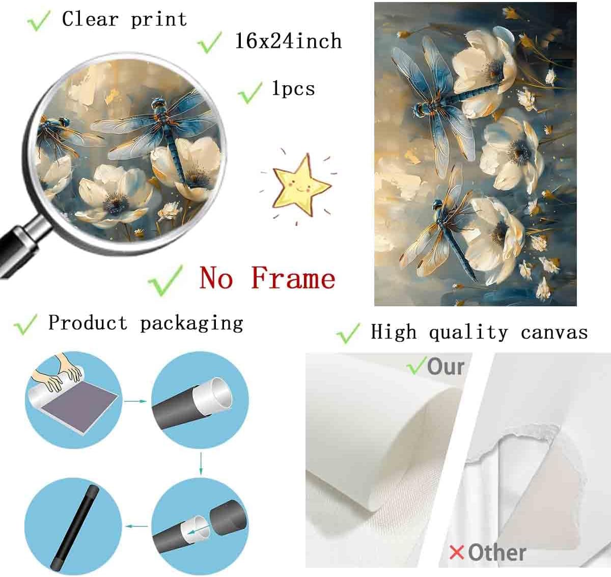 Dragonfly Wall Art White Flower Painting Watercolor Dragonfly Wall Art Watercolor Flower Prints Animal Canvas Plant Picture Insect Pictures Vintage Abstract Living Room Decor 16x24inch No Frame