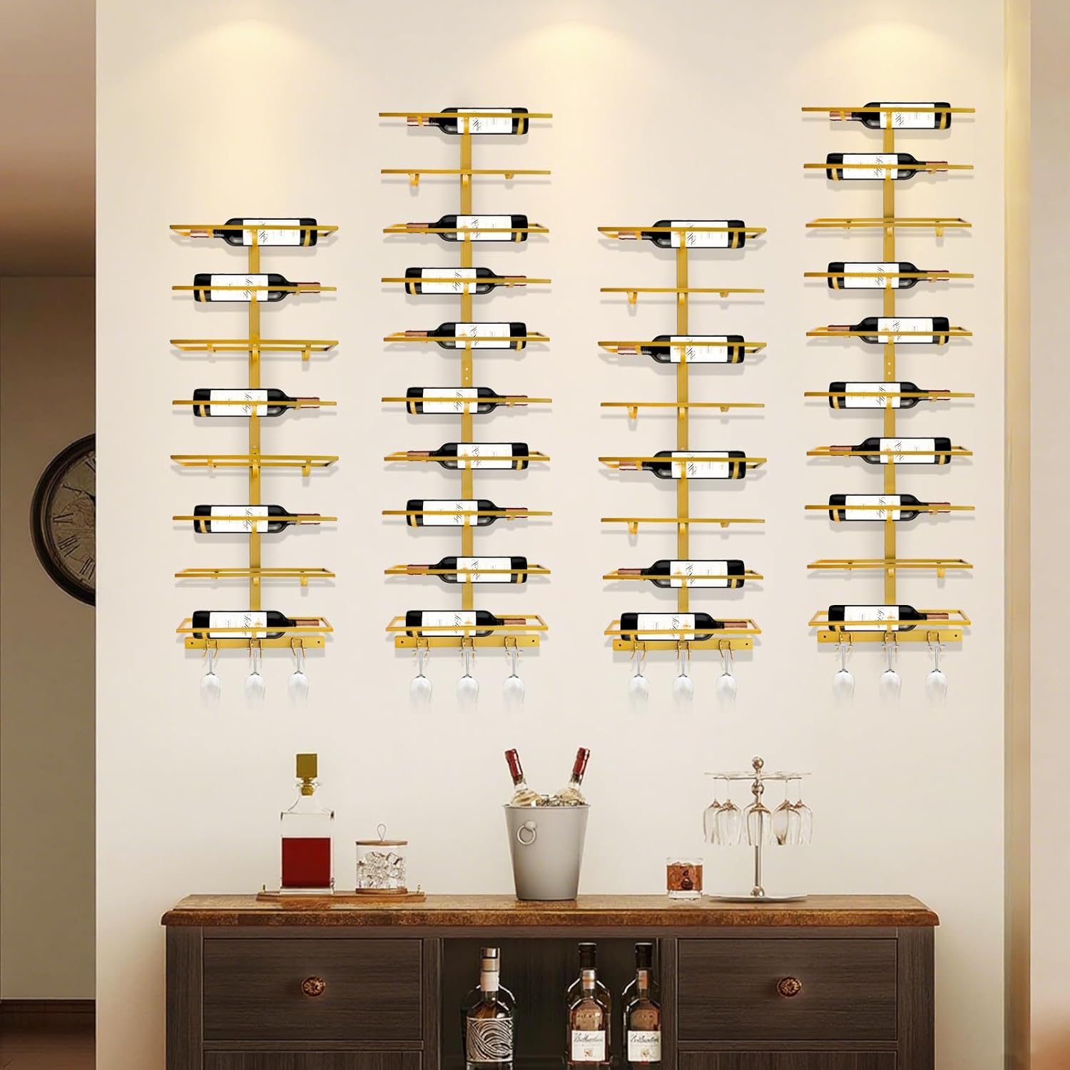 - Prevents Bottles from Falling: The wine glass rack wall mounted comes with a bottom bracket that is 0.5in/1.3cm wide, and each tier of wine shelf is supported by three bottom brackets to ensure that large and small bottles can be placed safely and attractively
